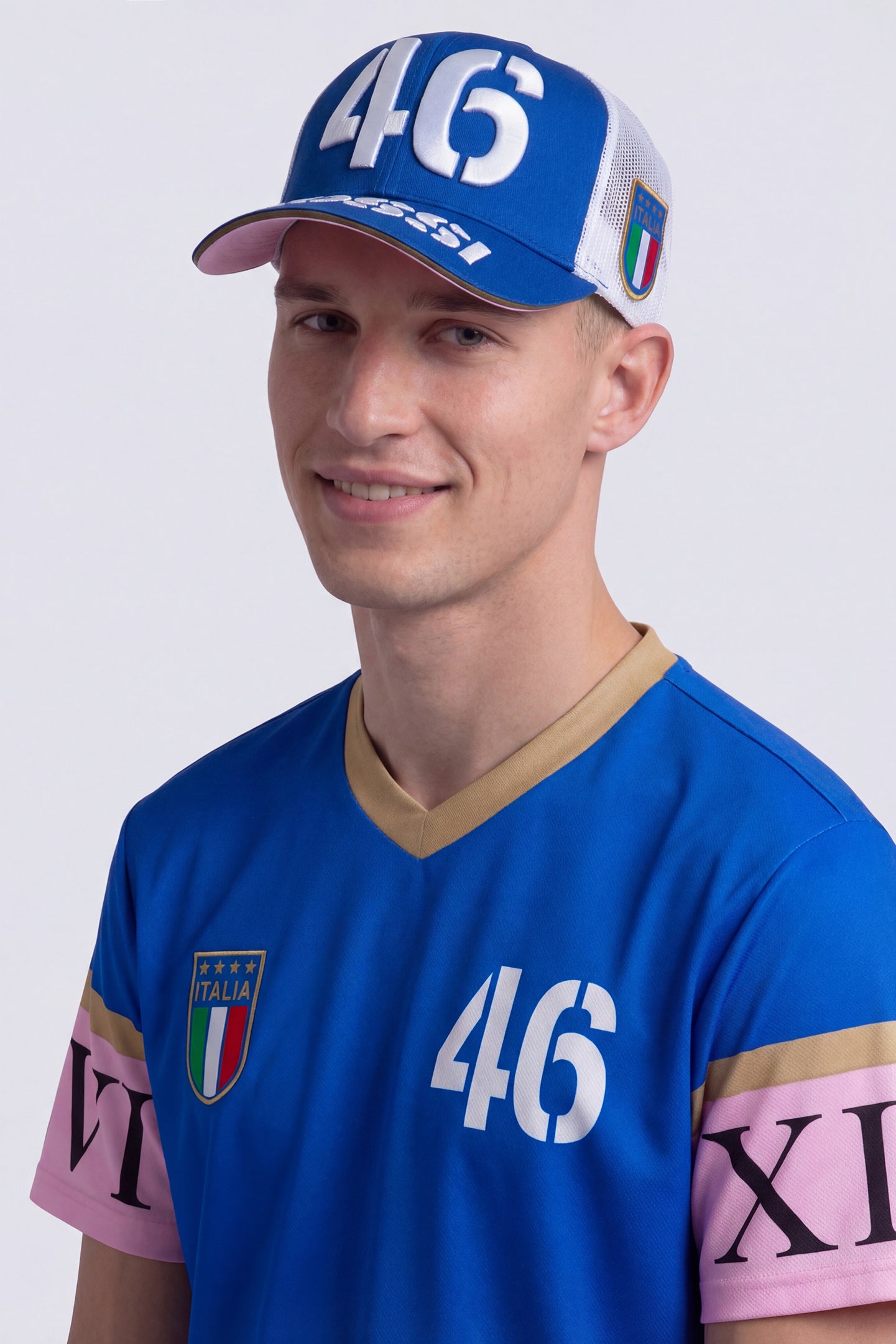 Cotton and polyester trucker cap from Valentino Rossi's VR46 Heritage collection, the line dedicated to the brands and historic moments of Valentino's career. The number 46 is embroidered on the front, and "Rossi" on the visor. The back features a soft, breathable mesh and the label that distinguishes the VR46 Heritage project. The lower part of the visor is pink. One size fits all, adjustable at the back.