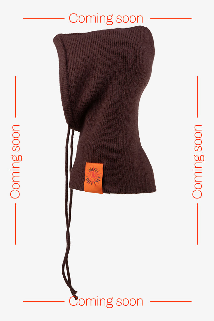 Balaclava from the Miss Fortysix Fall Winter capsule collection, created in collaboration with Francesca Sofia Novello. Made from soft, stretchy acrylic, it features a drawstring for adjusting the fit and an orange label on the front identifying the Miss Fortysix Fall-Winter capsule collection.