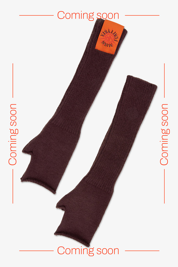 Gloves from the Miss Fortysix Fall Winter capsule collection, created in collaboration with Francesca Sofia Novello. Made from soft, warm, stretchy acrylic, they feature an opening at the fingers and an orange label identifying the Miss Fortysix Fall-Winter capsule collection.