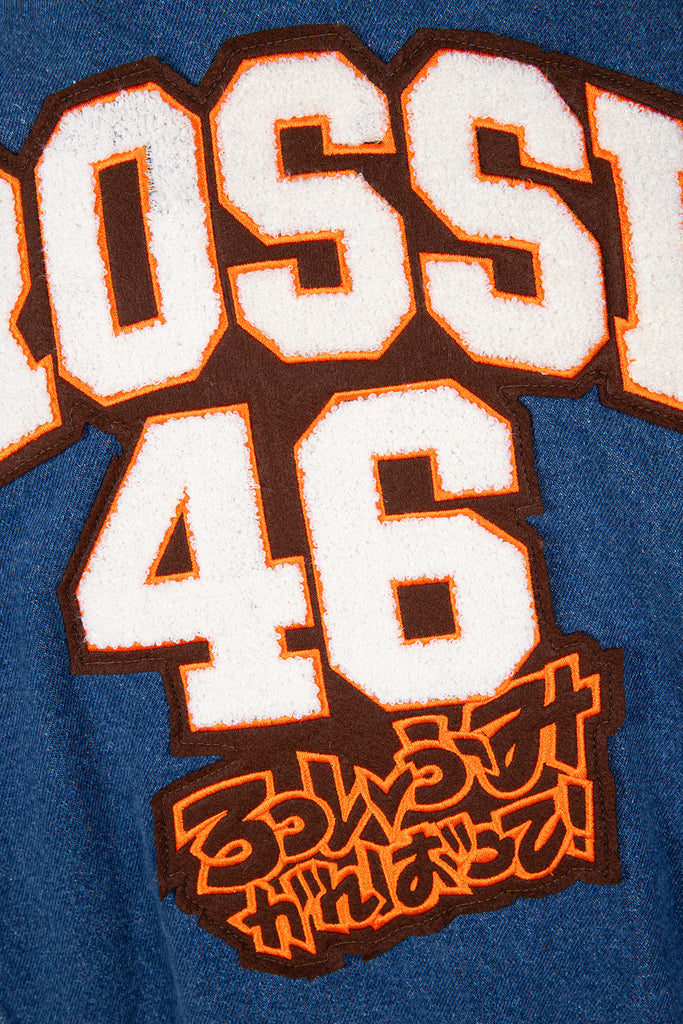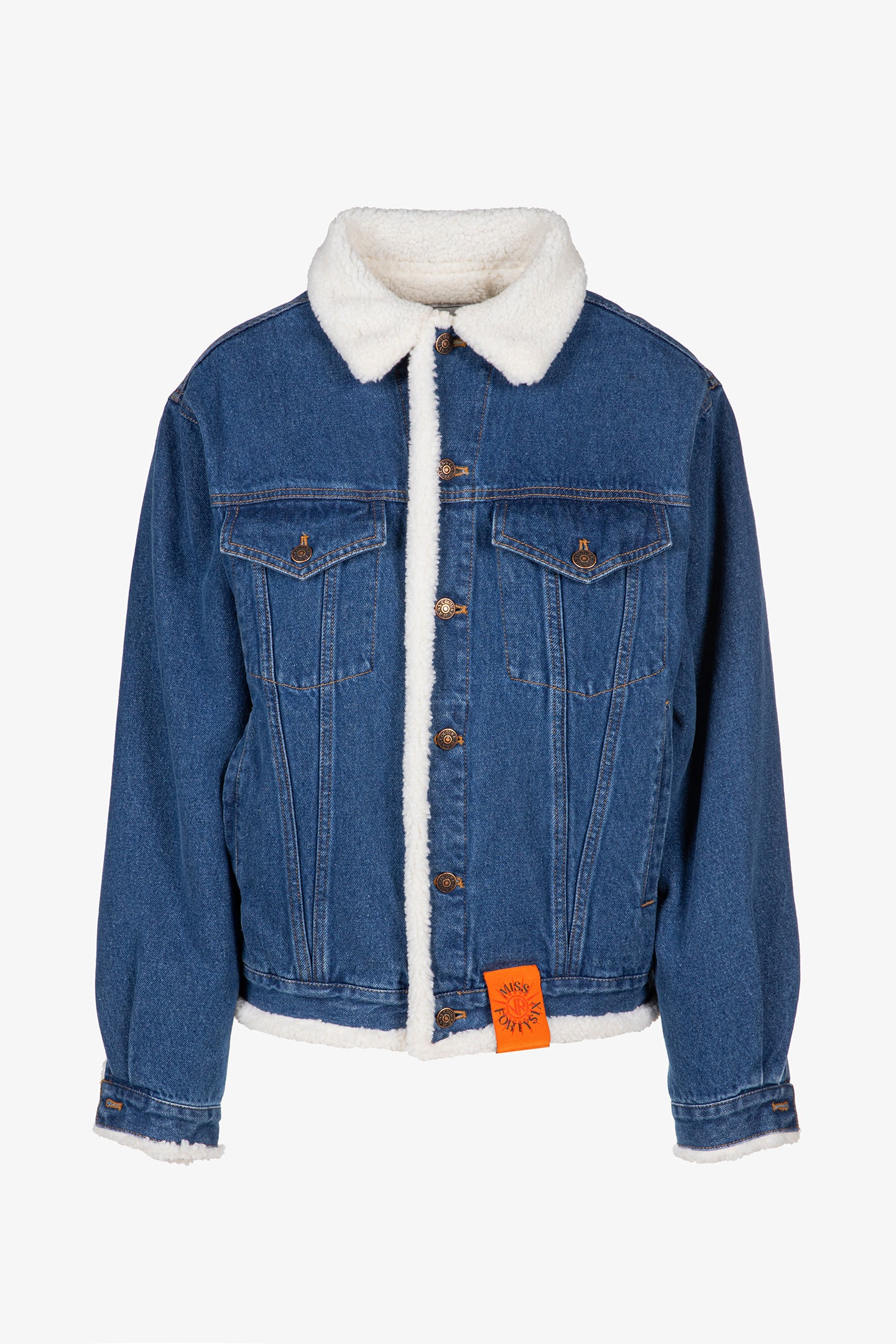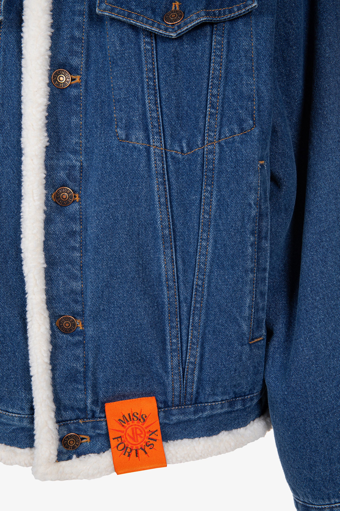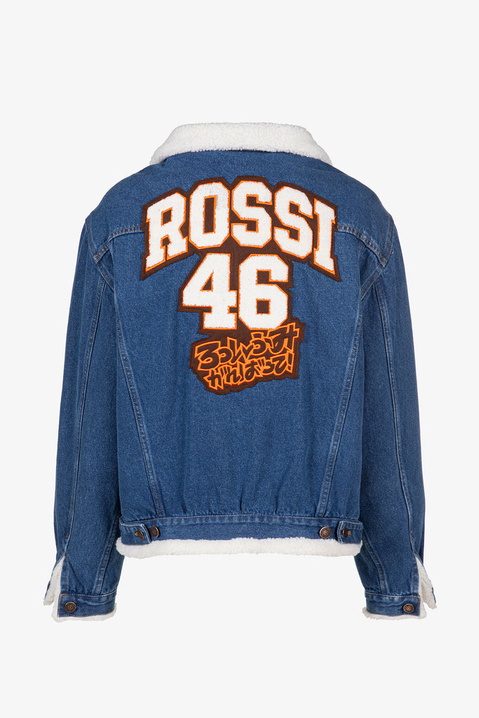 Sherpa Trucker jacket in denim from the Miss Fortysix Fall Winter capsule collection, created in collaboration with Francesca Sofia Novello and Forte dei Marmi Couture. Made of denim, with a comfortable and warm inner lining and collar. On the back is a large carpet stitch patch depicting "ROSSI 46" and "Rossifumi Ganbatte!" in Japanese characters. There are two front pockets at chest height and two side pockets. An orange label is applied to the front, identifying the Miss Fortysix Fall-Winter capsule collection. Made in Italy.