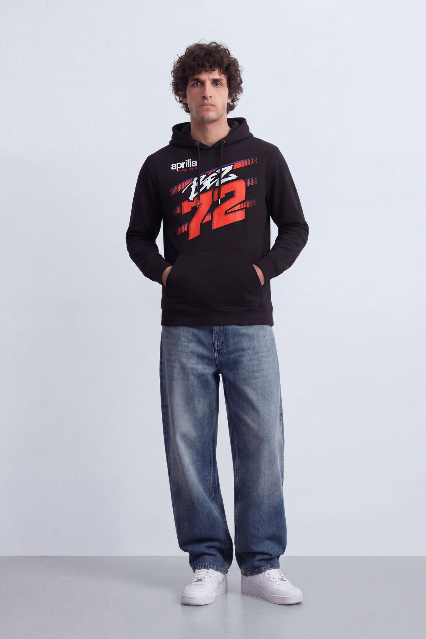 Aprilia and Marco Bezzecchi represent an outstanding Italian partnership that has captivated MotoGP fans everywhere. This collection celebrates the sporting partnership that will bind them together for years to come. A regular-fit hooded sweatshirt made from cotton and polyester. It features a full-length zip and two front pockets. The front features a print of the number 72, the Bez brand and the Aprilia Racing logo. On the back is the hashtag "Be a racer"