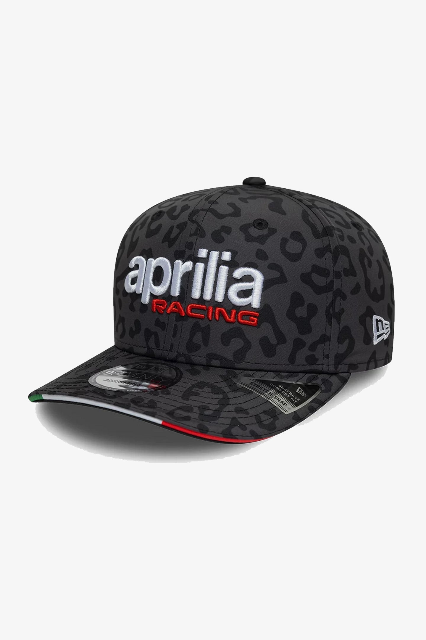 New Era cap, model 9SEVENTY EV OSFM, from the Aprilia Racing collection. A special edition for the 2026 Mugello GP, it is made from polyester and features the Aprilia Racing brand embroidered on the front and the iconic New Era logo embroidered on the side. The shell has an animal print texture. On the back is the ‘#be a racer’ patch. One size fits all, adjustable.