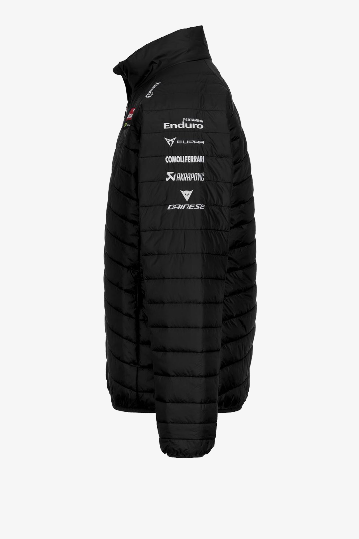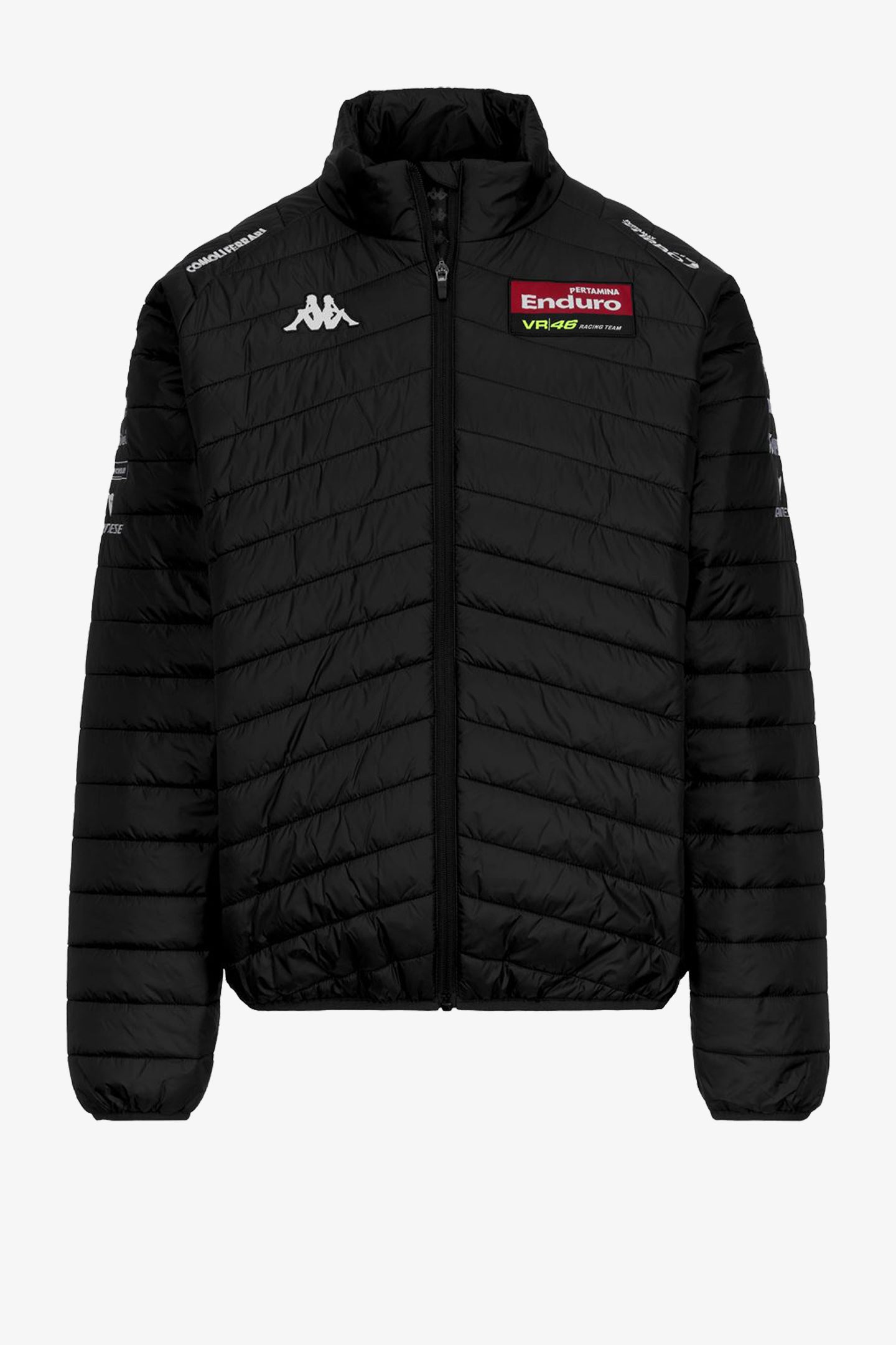 Official replica jacket of the Pertamina Enduro VR46 Racing Team worn by Franco Morbidelli, Fabio Di Giannantonio and the entire team during the 2026 season. Made of polyester and polyamide, in collaboration with Kappa, it features the Pertamina Enduro VR46 Racing Team, Kappa and Ducati logos on the chest. The sleeves feature the team sponsors and the back features the Kappa and VR46 Racing Team logos. There are two side pockets with zip closures.