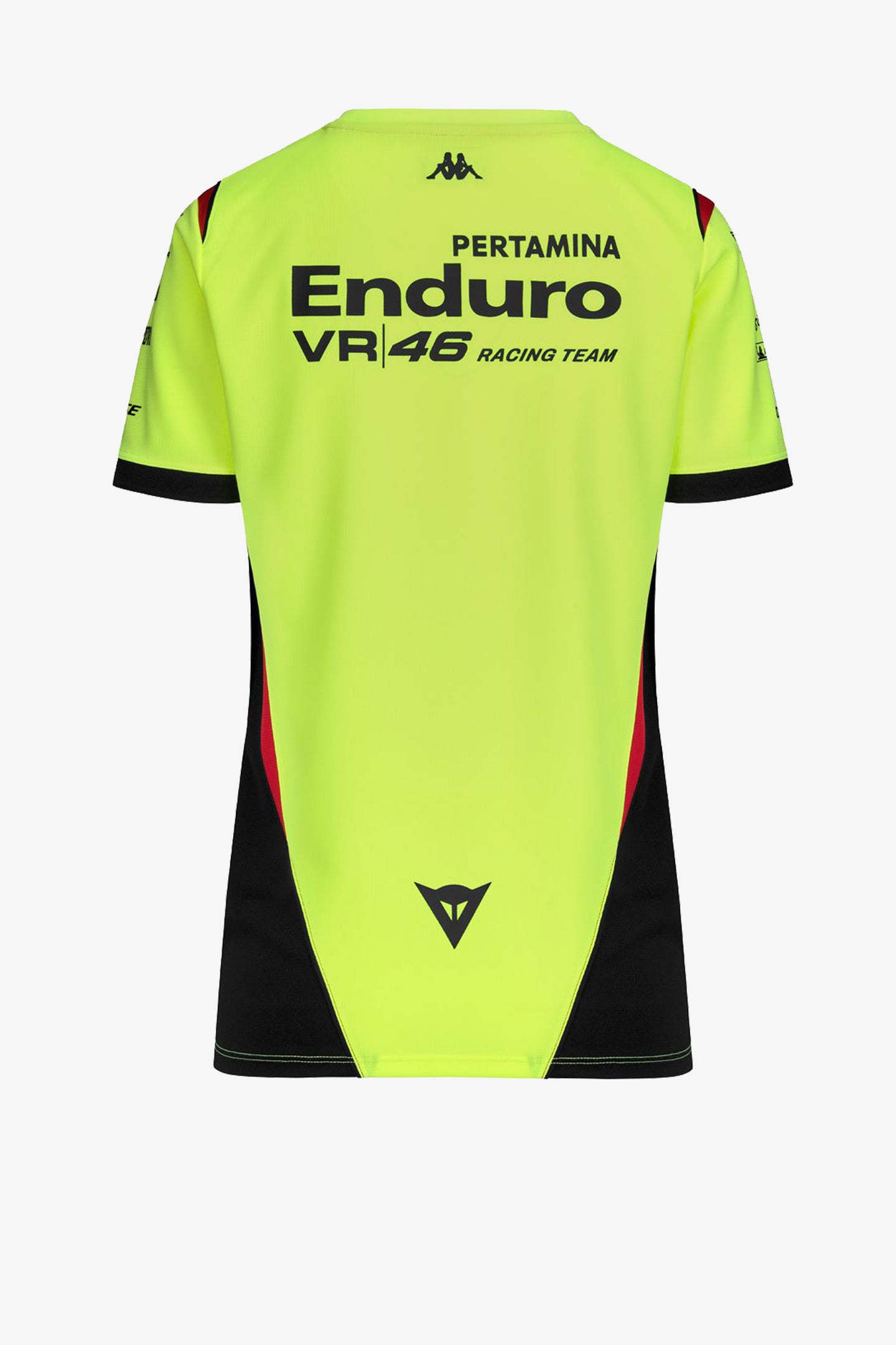 Official replica women's polo shirt of the Pertamina Enduro VR46 Racing Team worn by Franco Morbidelli, Fabio Di Giannantonio and the entire team during the 2026 season. Made of polyester, in collaboration with Kappa, it features the Pertamina Enduro VR46 Racing Team logo on the chest and back and the team's sponsor logos on the sleeves. There is a zip fastening at the front and a small zip pocket on the chest. Contrasting black and red details complete the design.