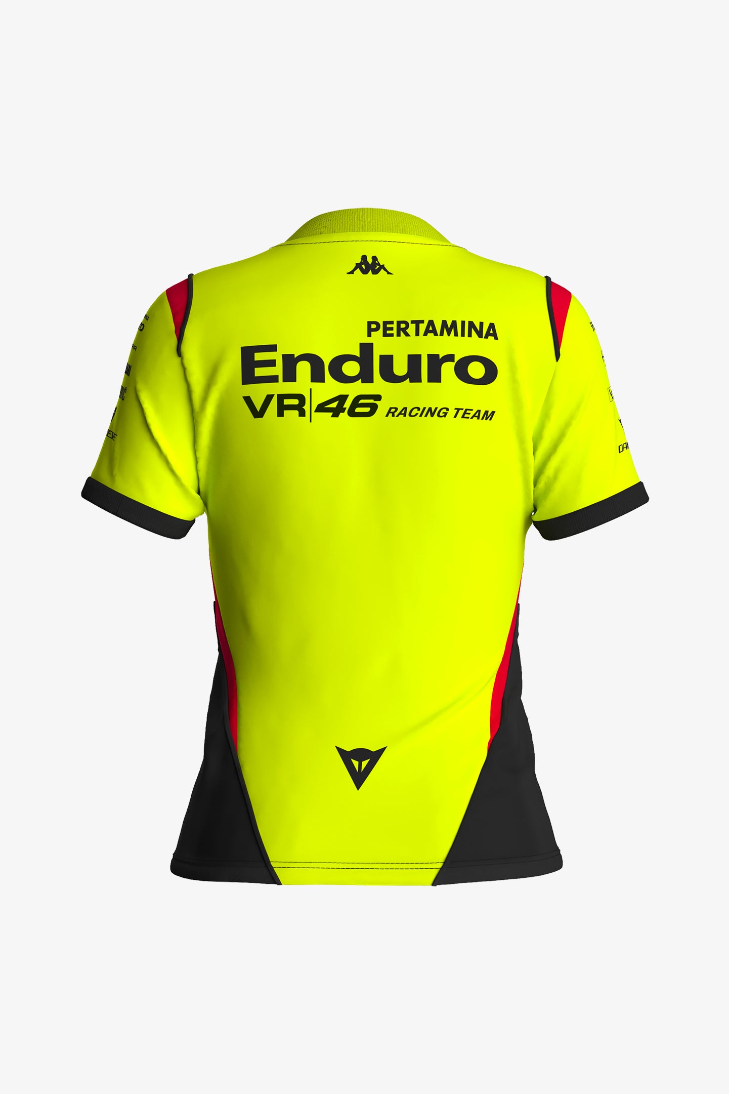 Official replica women's polo shirt of the Pertamina Enduro VR46 Racing Team worn by Franco Morbidelli, Fabio Di Giannantonio and the entire team during the 2026 season. Made of polyester, in collaboration with Kappa, it features the Pertamina Enduro VR46 Racing Team logo on the chest and back and the team's sponsor logos on the sleeves. There is a zip fastening at the front and a small zip pocket on the chest. Contrasting black and red details complete the design.