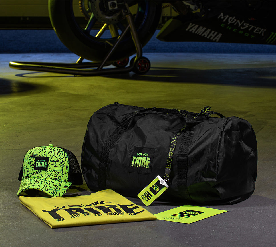 The kit contains a personalised pass like the one used in MotoGP, a trucker cap with special graphics, a T-shirt with the large VR46Tribe project logo, a bag with the Tribe Pass logo and a postcard with Valentino's autograph printed on it.