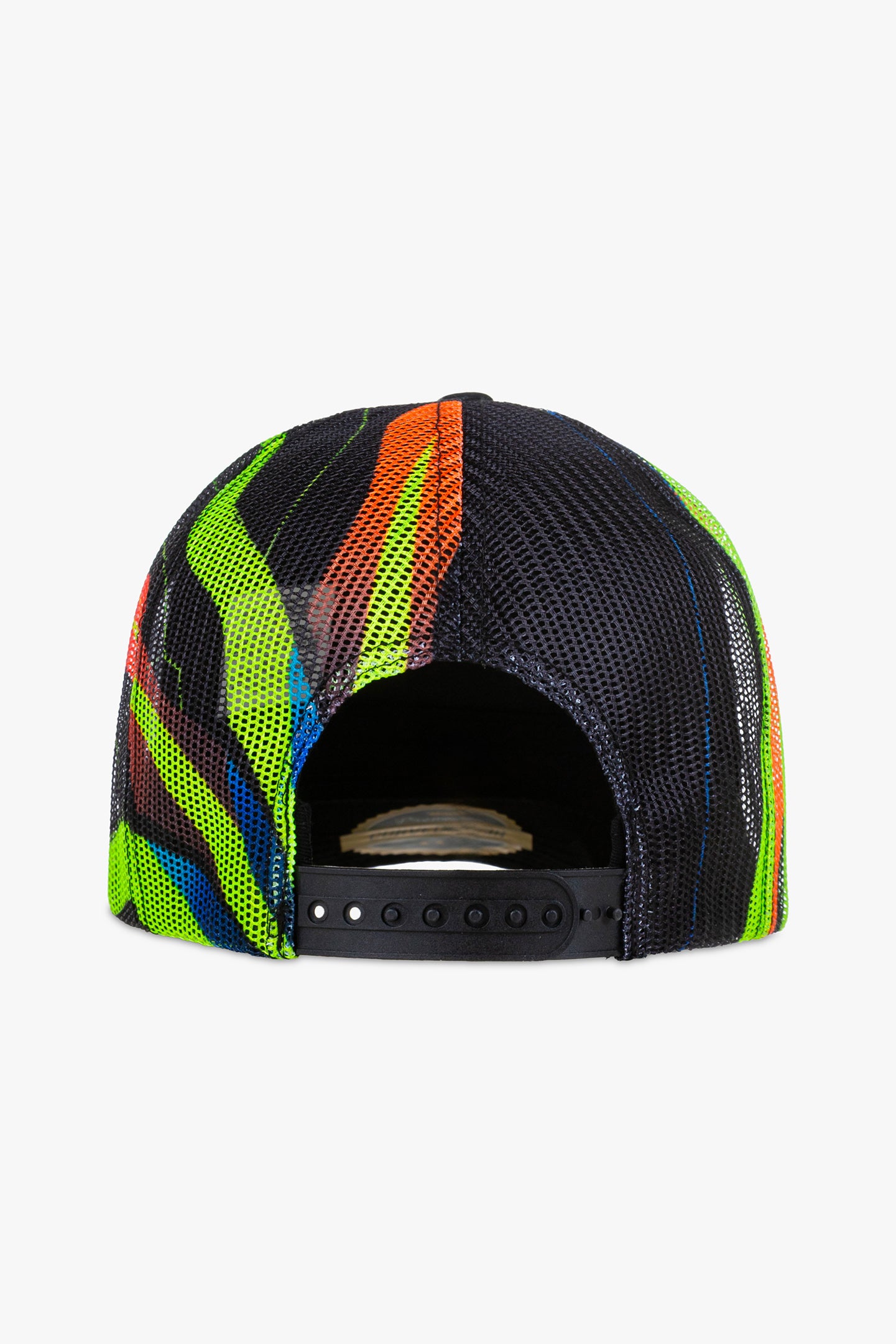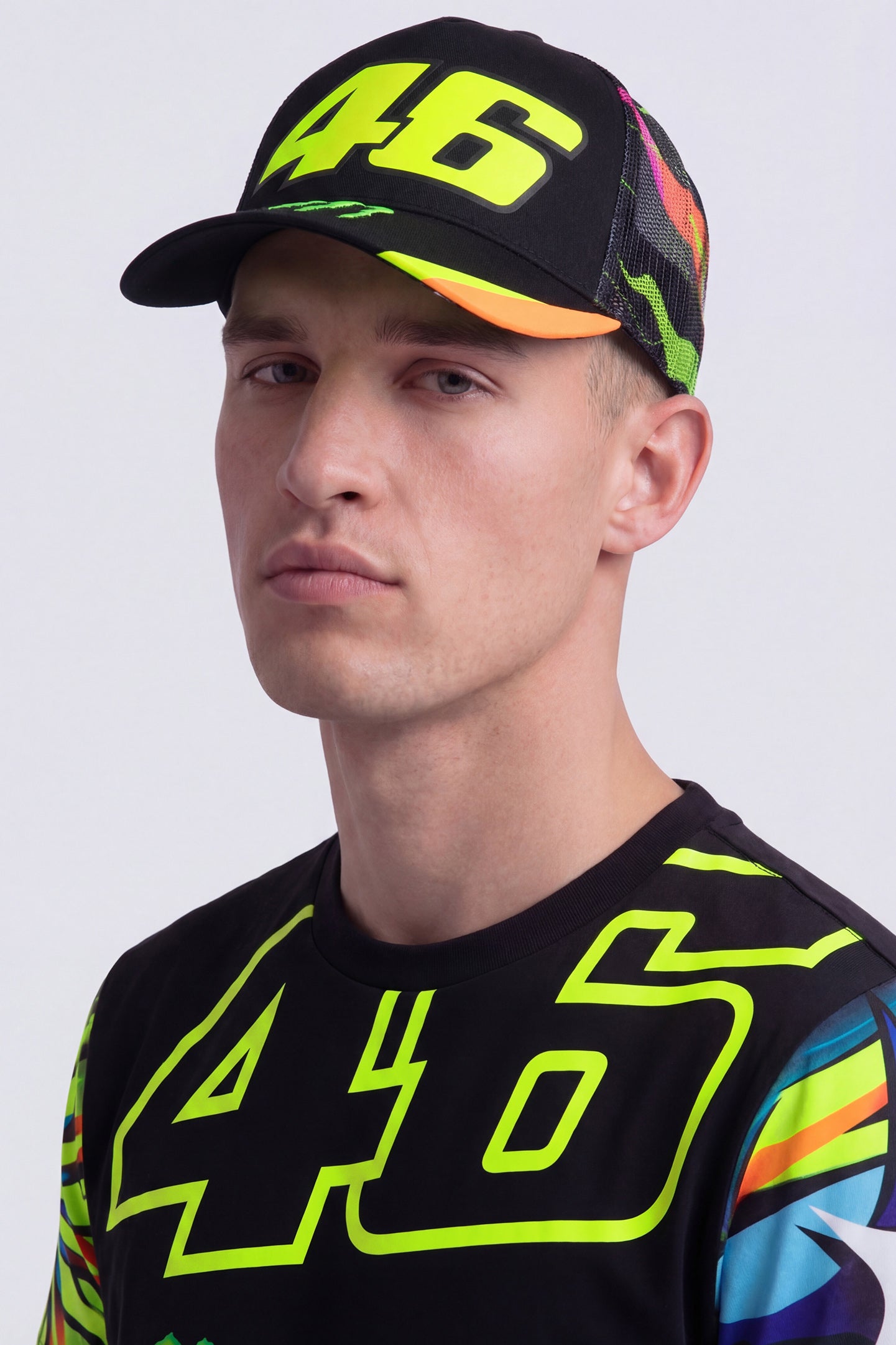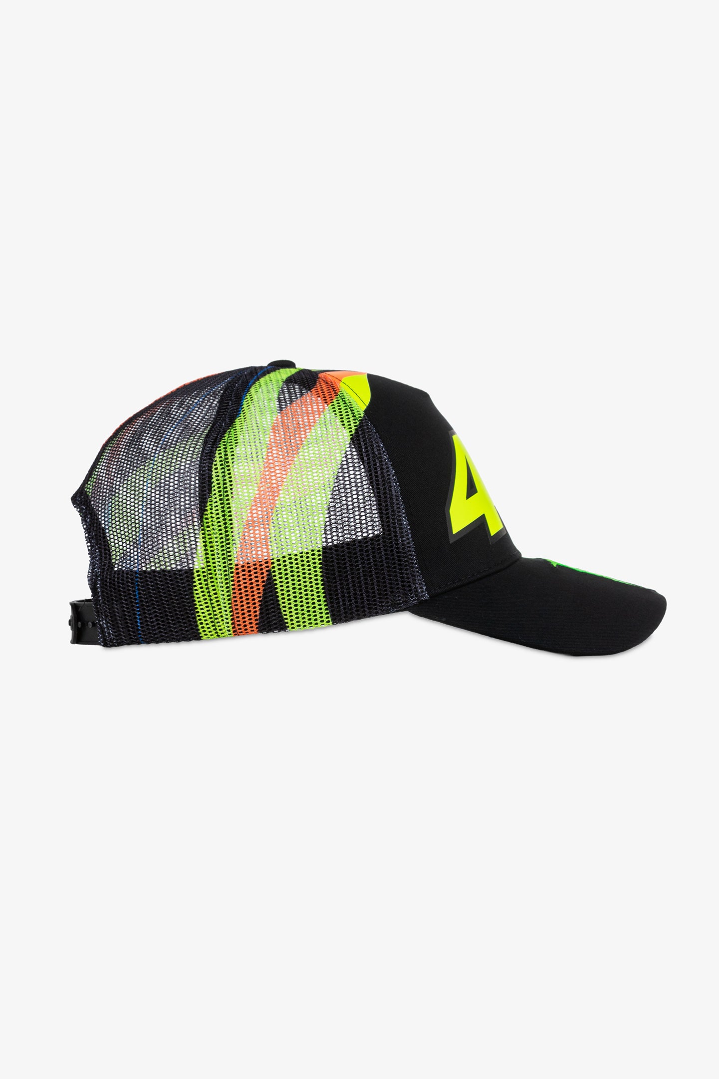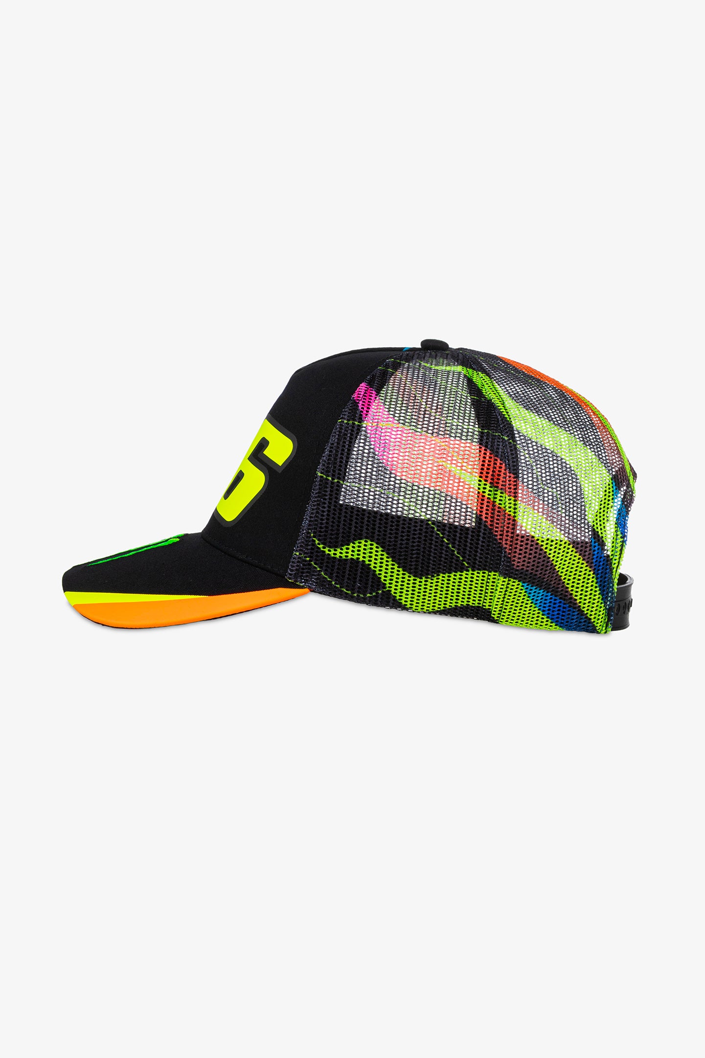 Cotton and polyester trucker cap from the Monster VR46 collection. Number 46 printed on the front, Monster Energy claw embroidered on the visor. Soft, breathable mesh on the back with sun and moon graphic print, featured on Valentino Rossi's helmet. One size fits all, adjustable at the back.