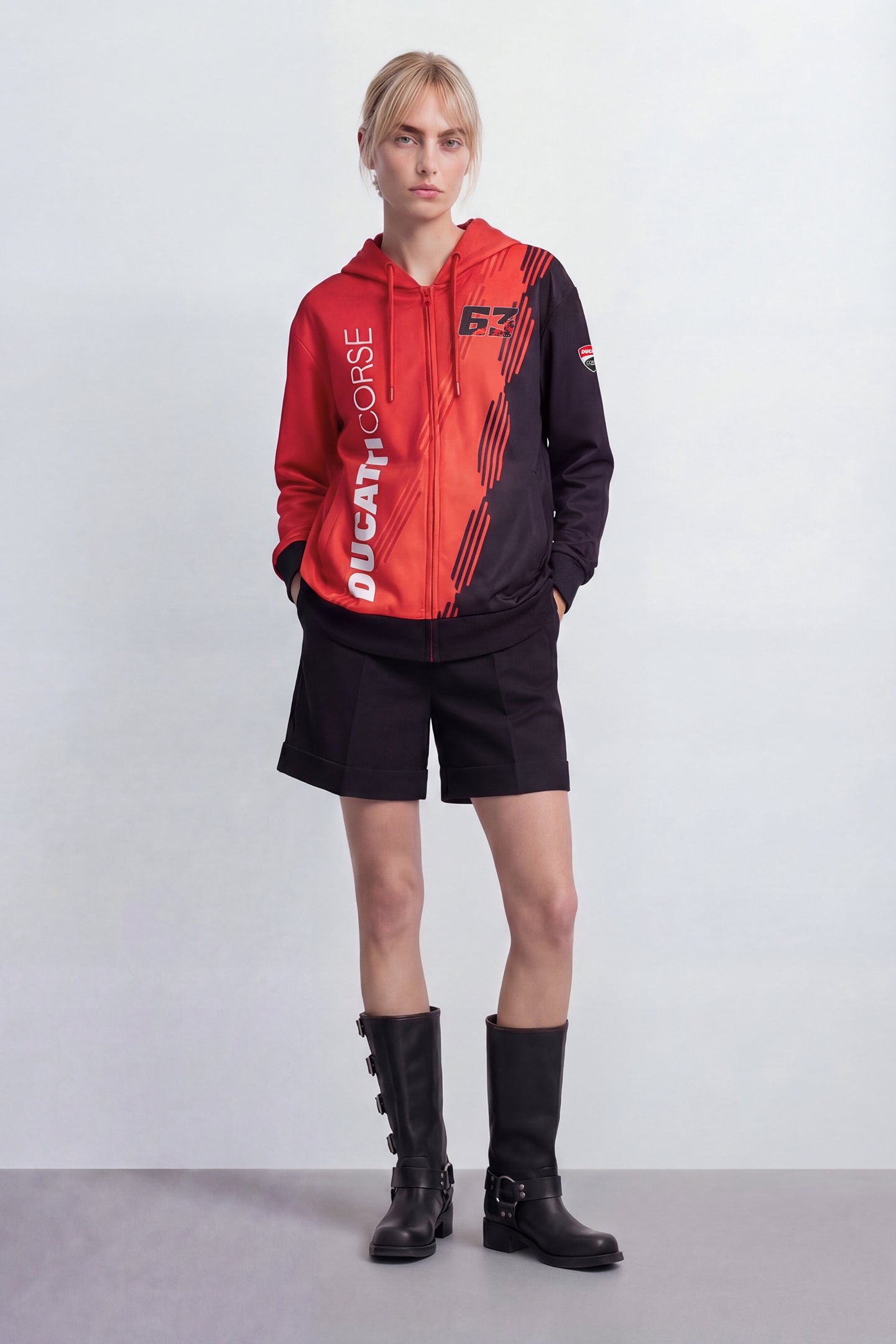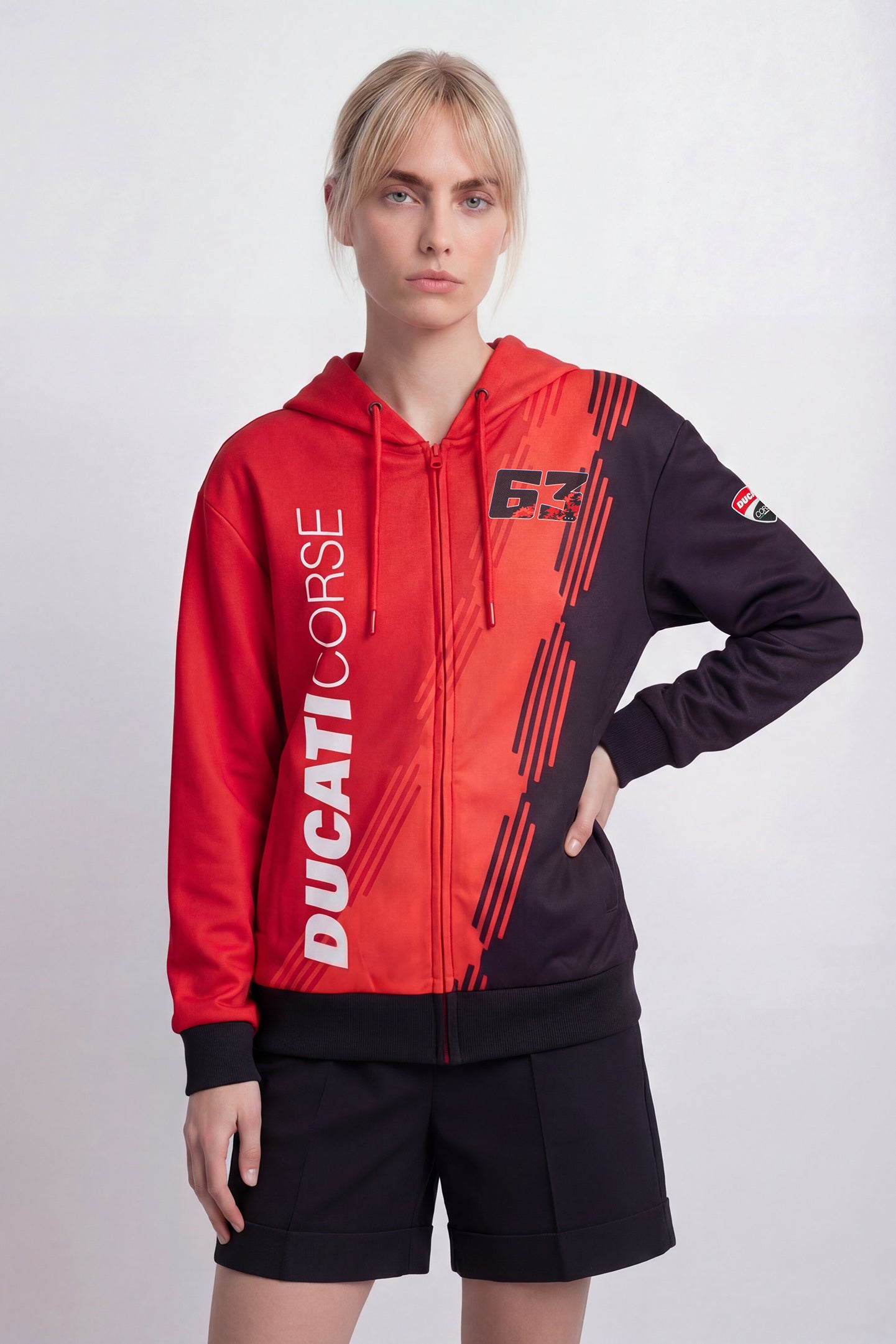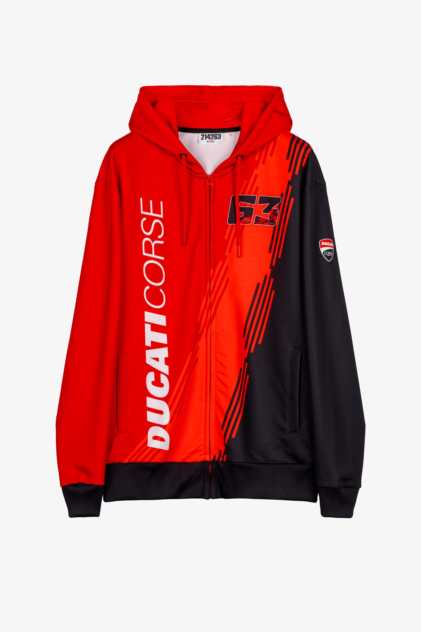 Polyester hoodie from Francesco Bagnaia's Dual Ducati Corse collection. Full-length zip at the front, two pockets, number 63 and Ducati Corse logo on a graphic pattern. Number 63 and "GoFree" on the back, Ducati Corse shield on the sleeve.