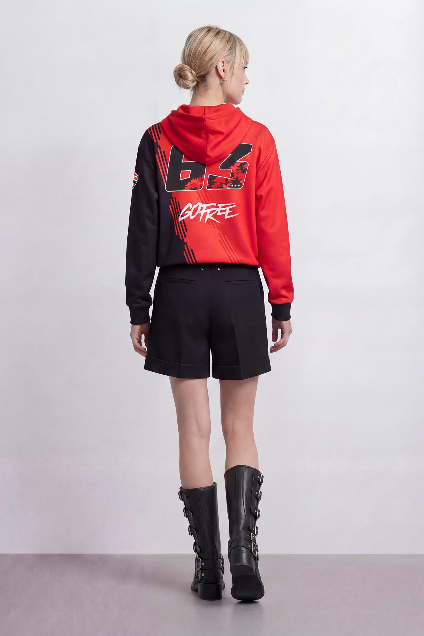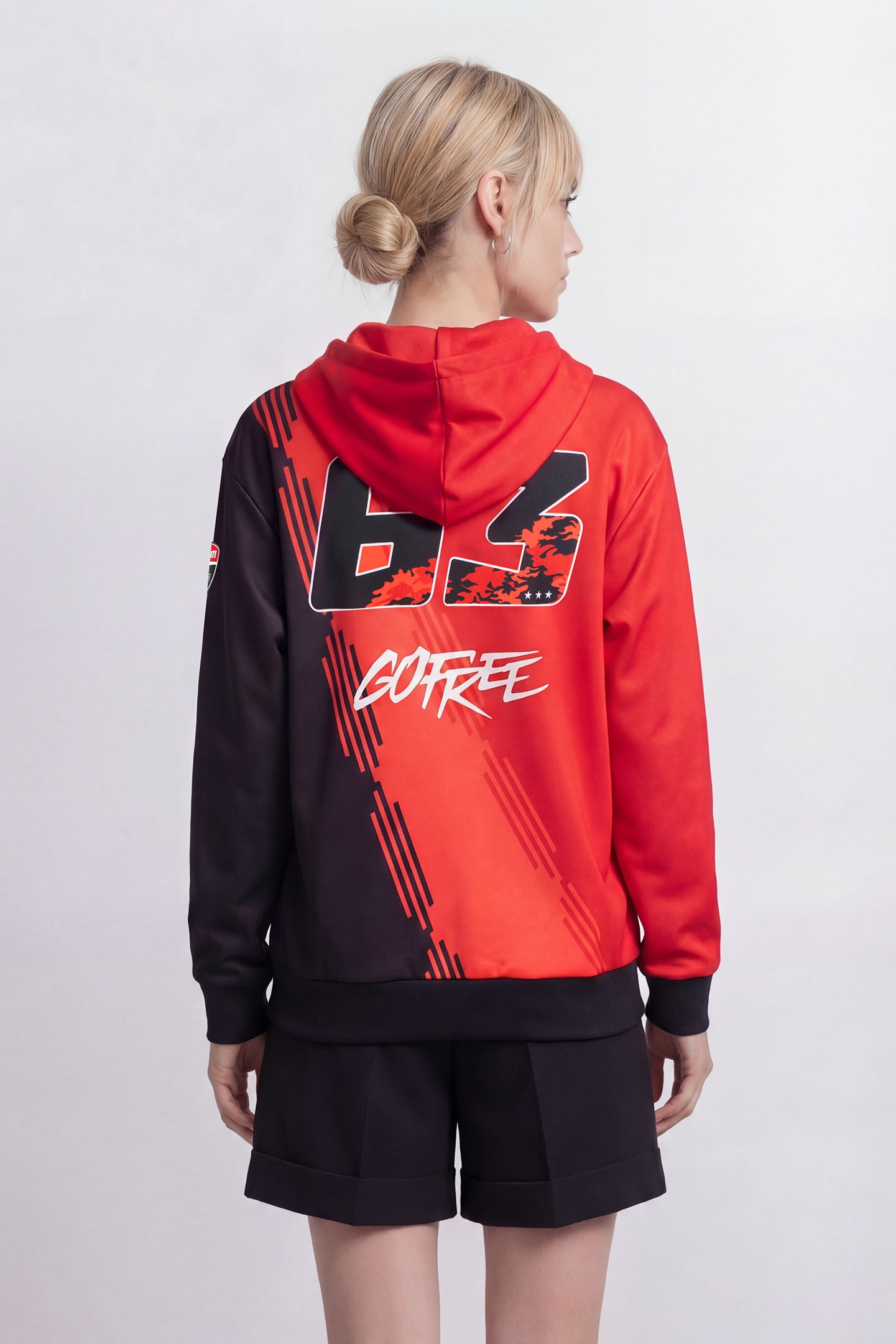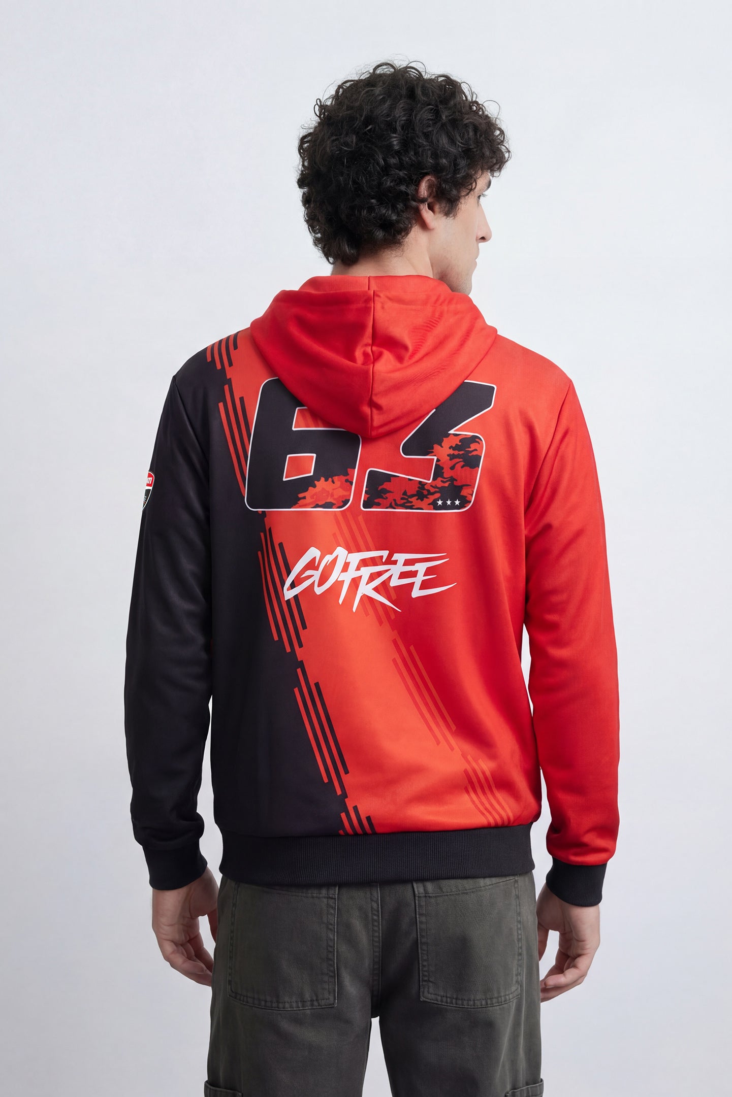 Polyester hoodie from Francesco Bagnaia's Dual Ducati Corse collection. Full-length zip at the front, two pockets, number 63 and Ducati Corse logo on a graphic pattern. Number 63 and "GoFree" on the back, Ducati Corse shield on the sleeve.