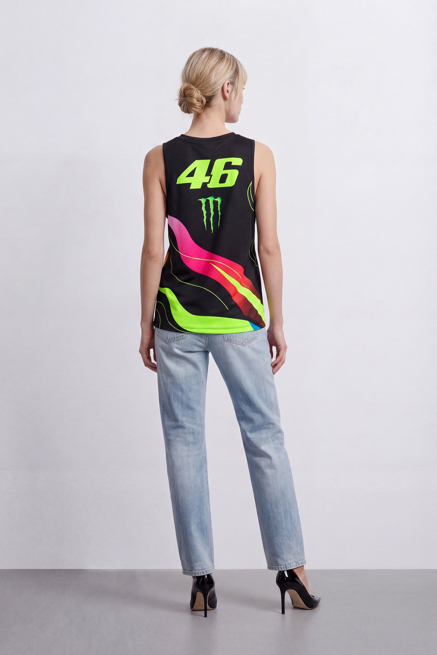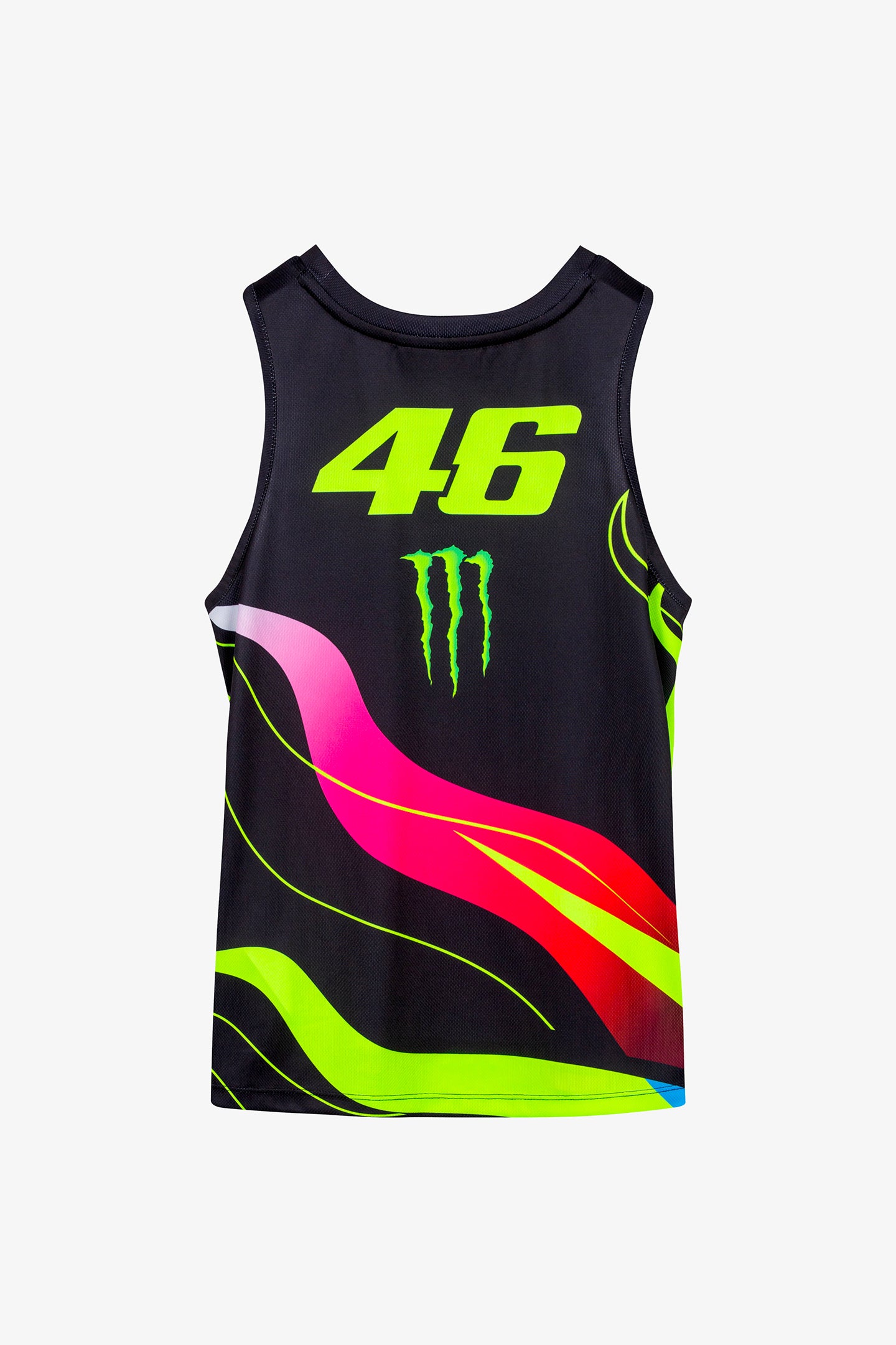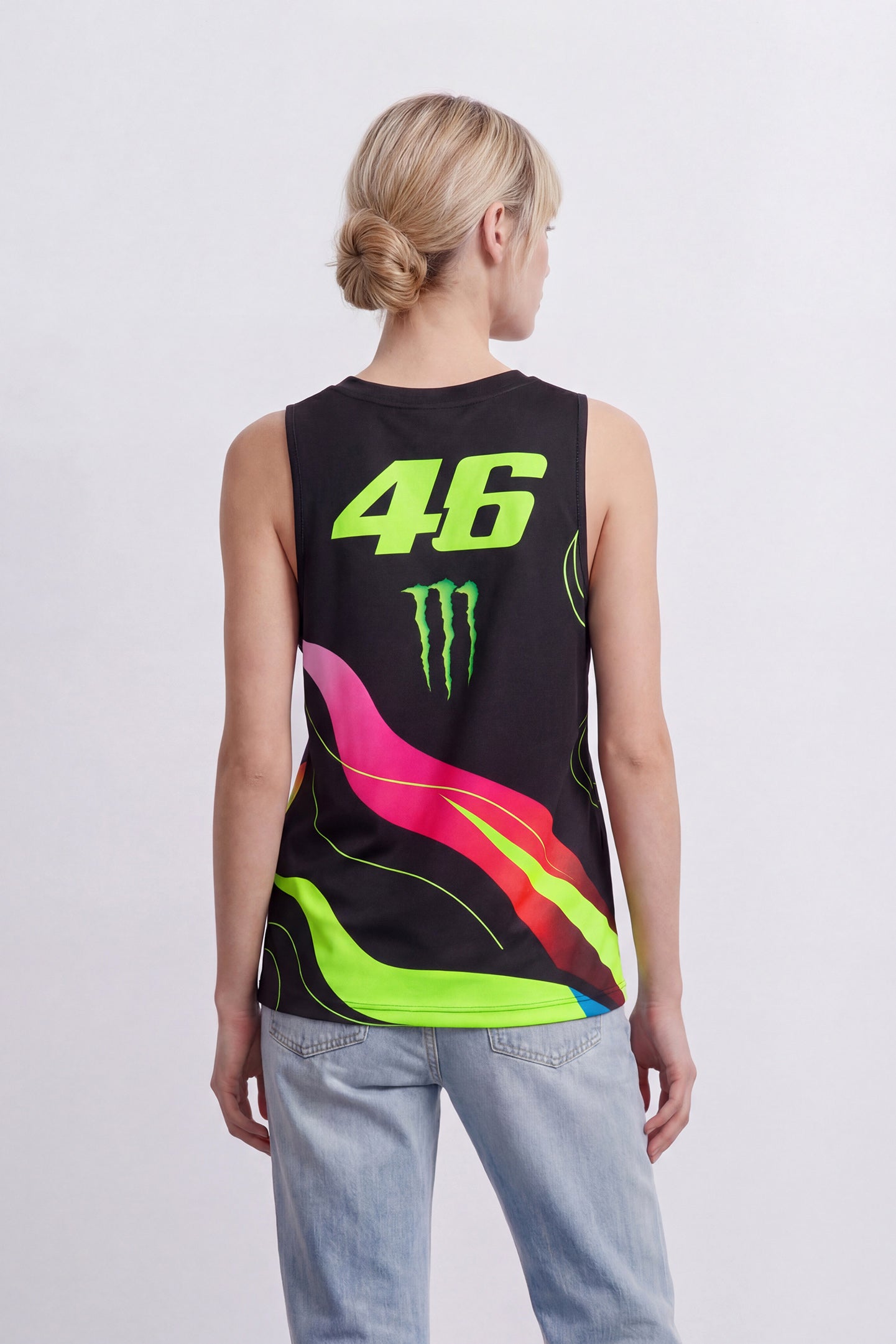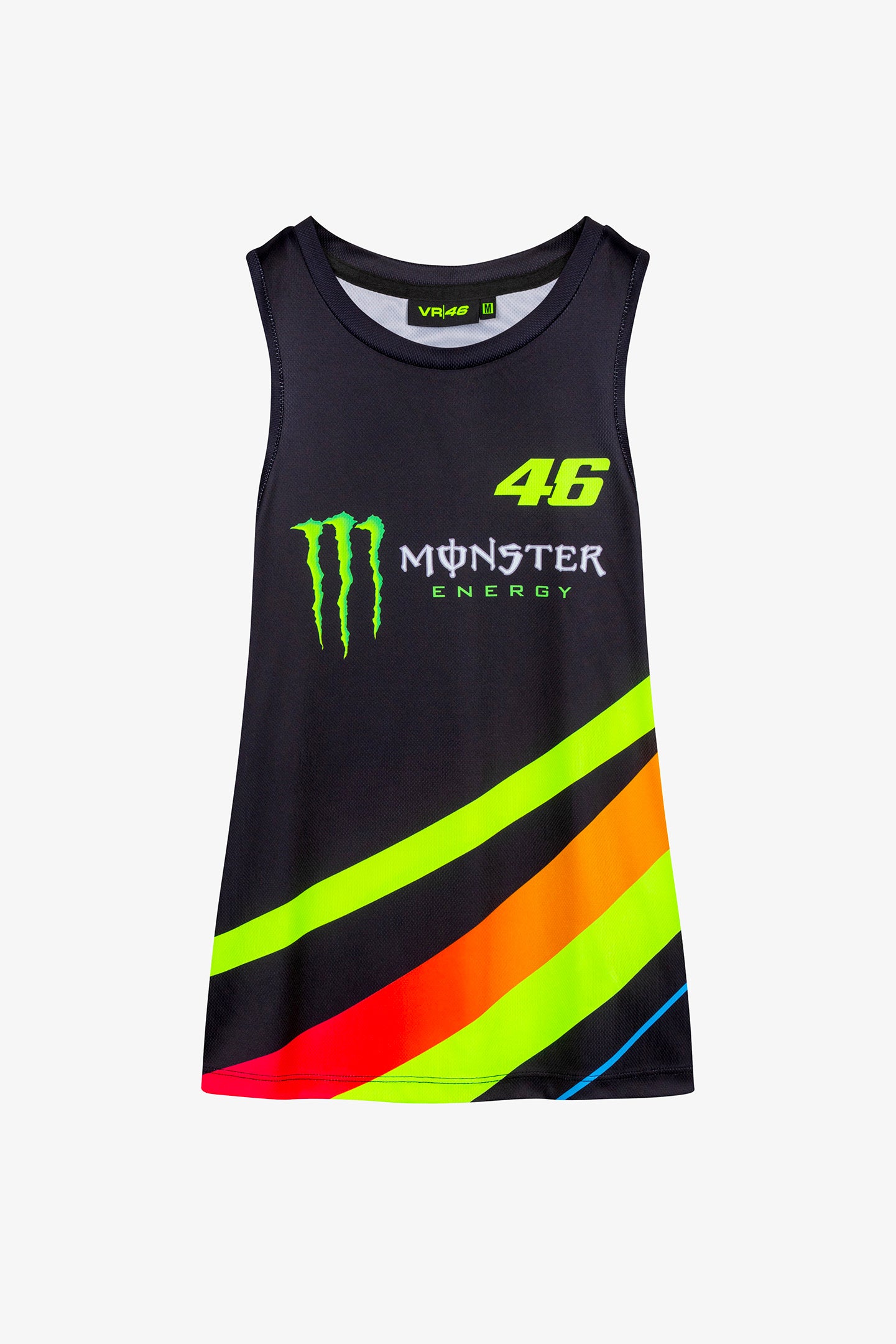 Women's polyester tank top from the Monster VR46 collection. Features the number 46 and Monster Energy logos on the front and back. The sun and moon graphic is inspired by the helmet worn by Valentino Rossi.