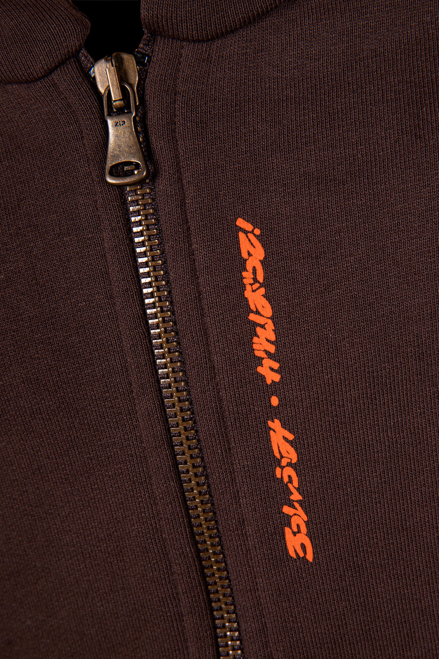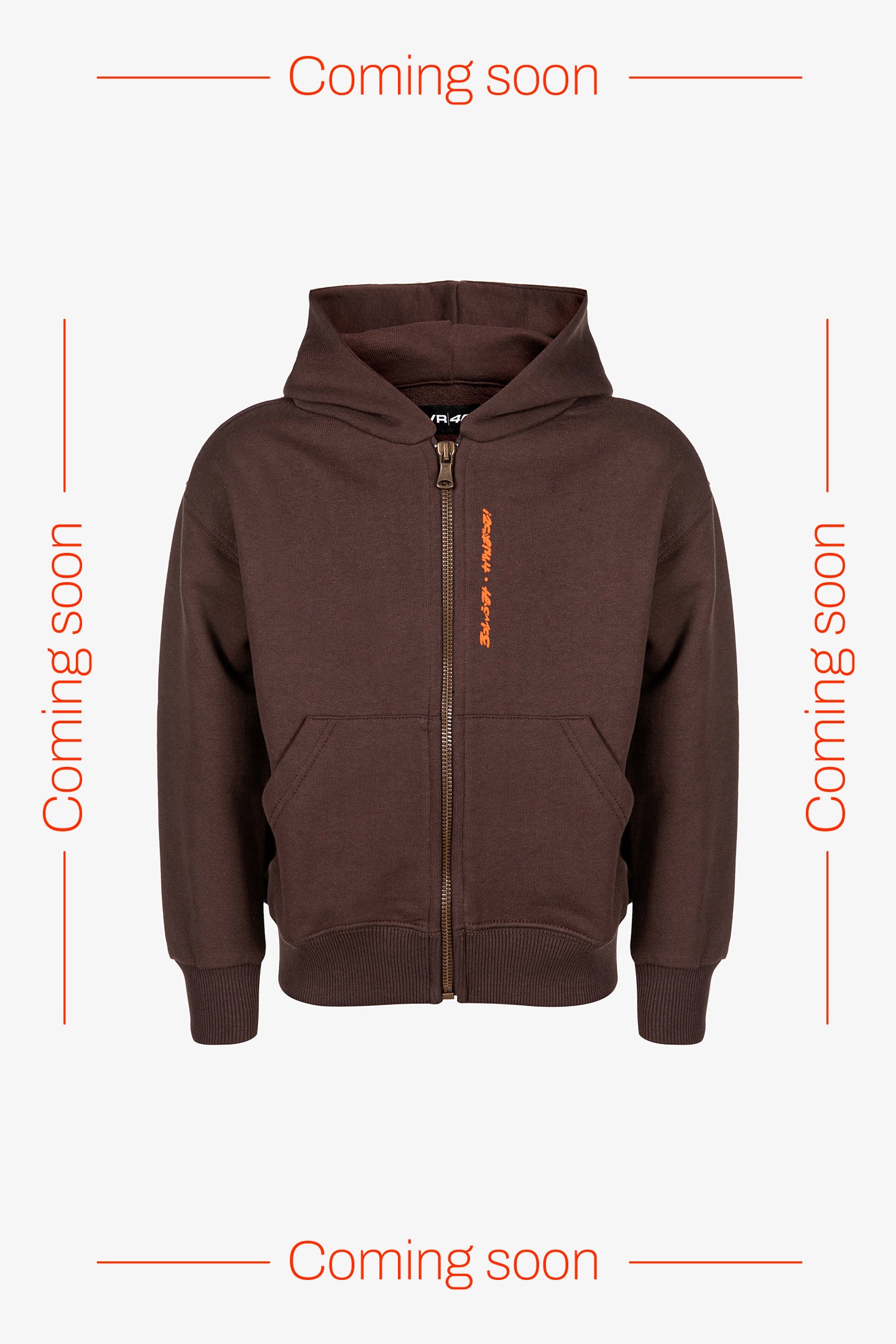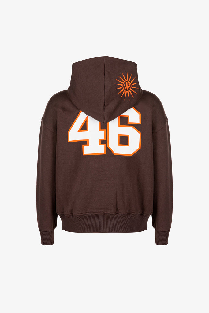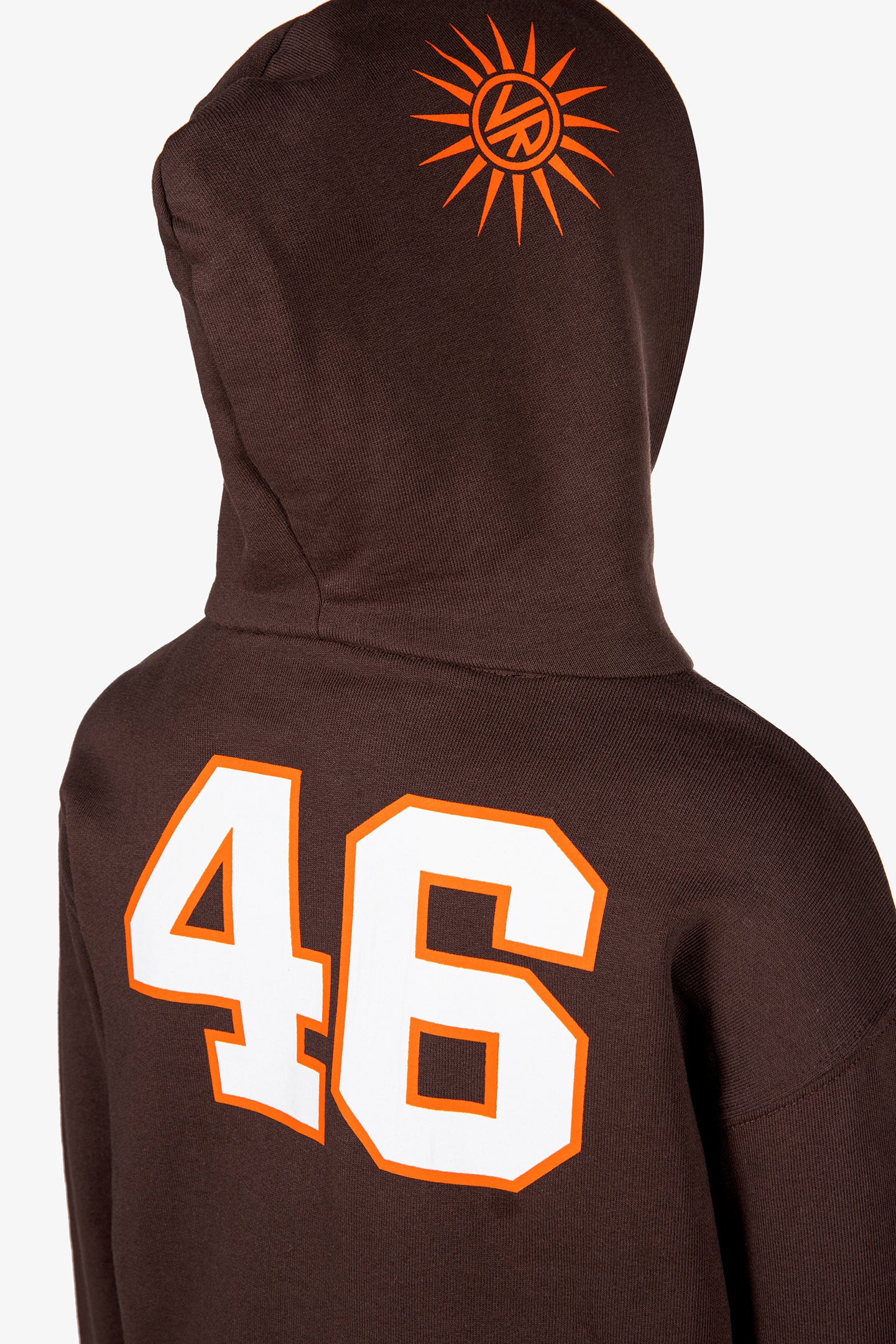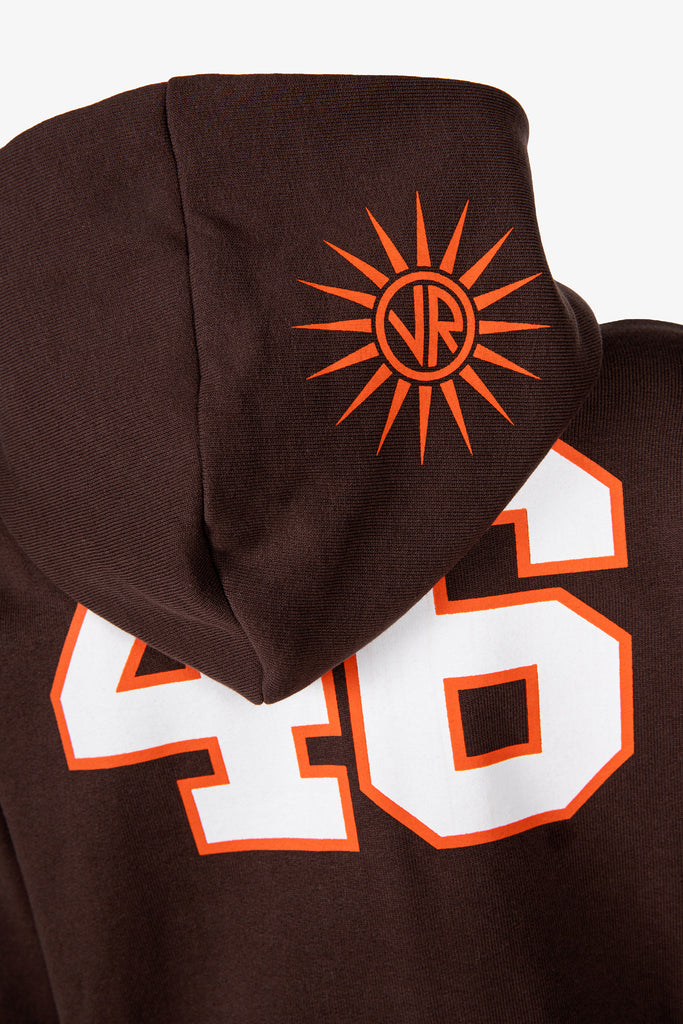 Children's hooded oversize sweatshirt from the Mini Fortysix Fall Winter capsule collection, created in collaboration with Francesca Sofia Novello. It features a full-length zip and two front pockets. The front is printed with "Rossifumi Ganbatte!" in Japanese characters, the back with a large number 46 and a small sun print with the VR logo on the hood. Made of cotton, produced in Italy.