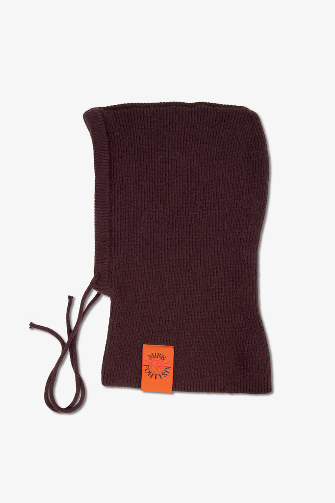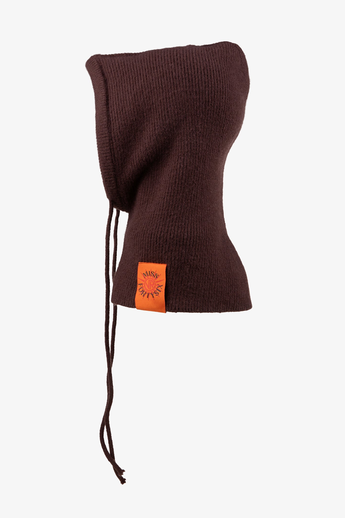 Balaclava from the Miss Fortysix Fall Winter capsule collection, created in collaboration with Francesca Sofia Novello. Made from soft, stretchy acrylic, it features a drawstring for adjusting the fit and an orange label on the front identifying the Miss Fortysix Fall-Winter capsule collection.