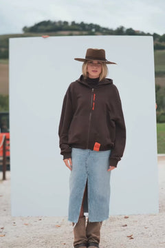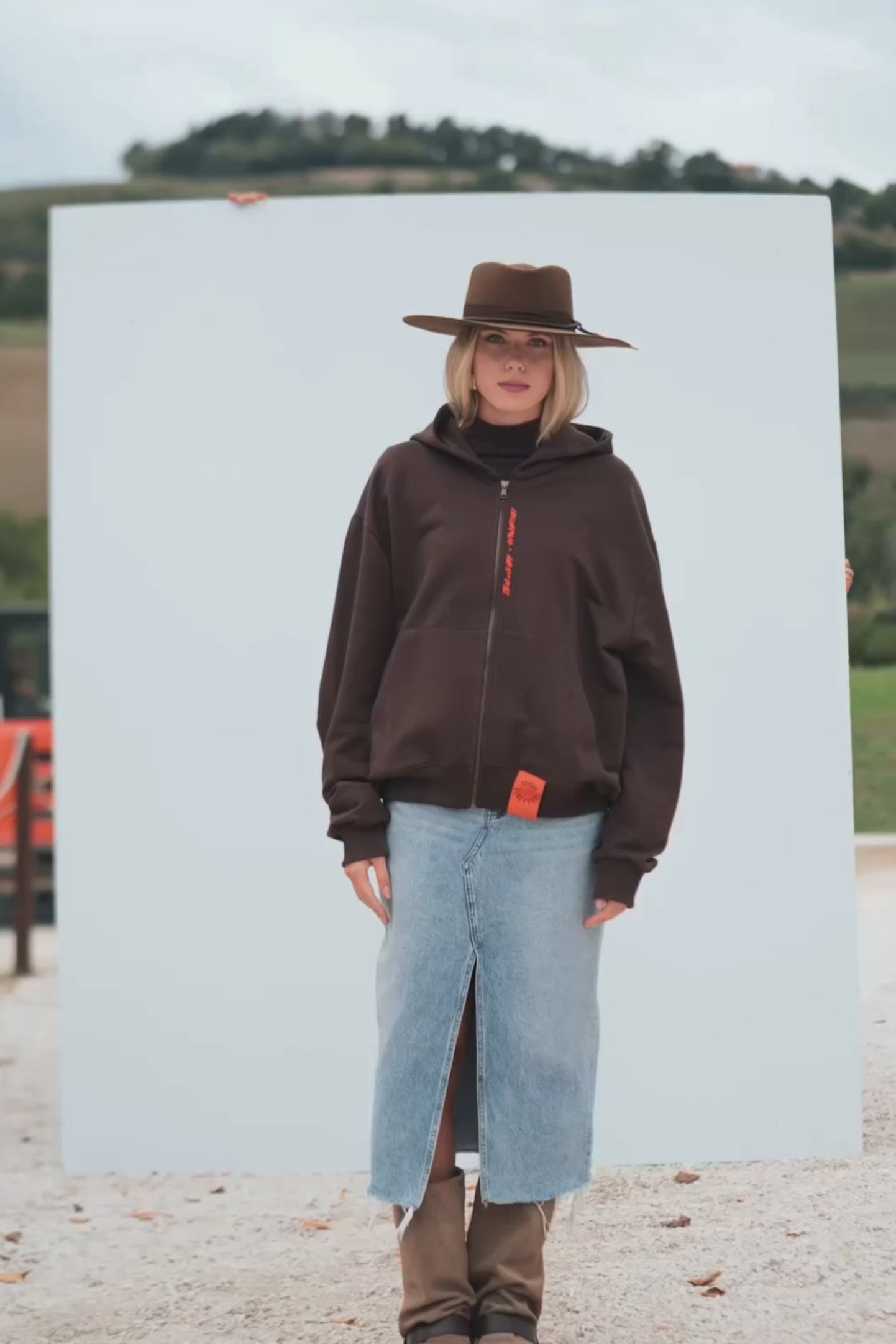 Oversized hoodie from the Miss Fortysix Fall Winter capsule collection, created in collaboration with Francesca Sofia Novello. It features a full-length zip and two front pockets. The front is printed with "Rossifumi Ganbatte!" in Japanese characters and has an orange label identifying the Miss Fortysix Fall-Winter capsule collection. The back features a large number 46. Made of cotton, made in Italy.