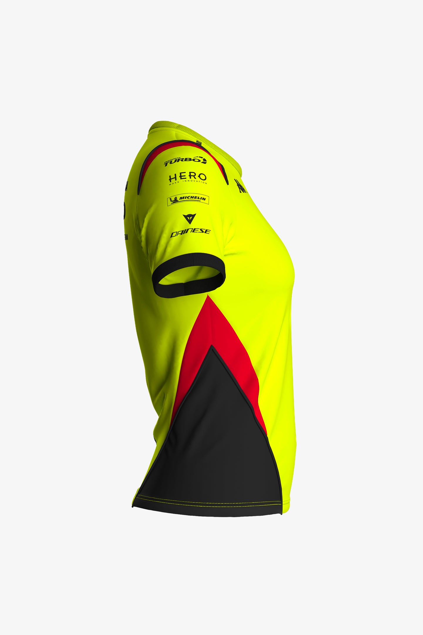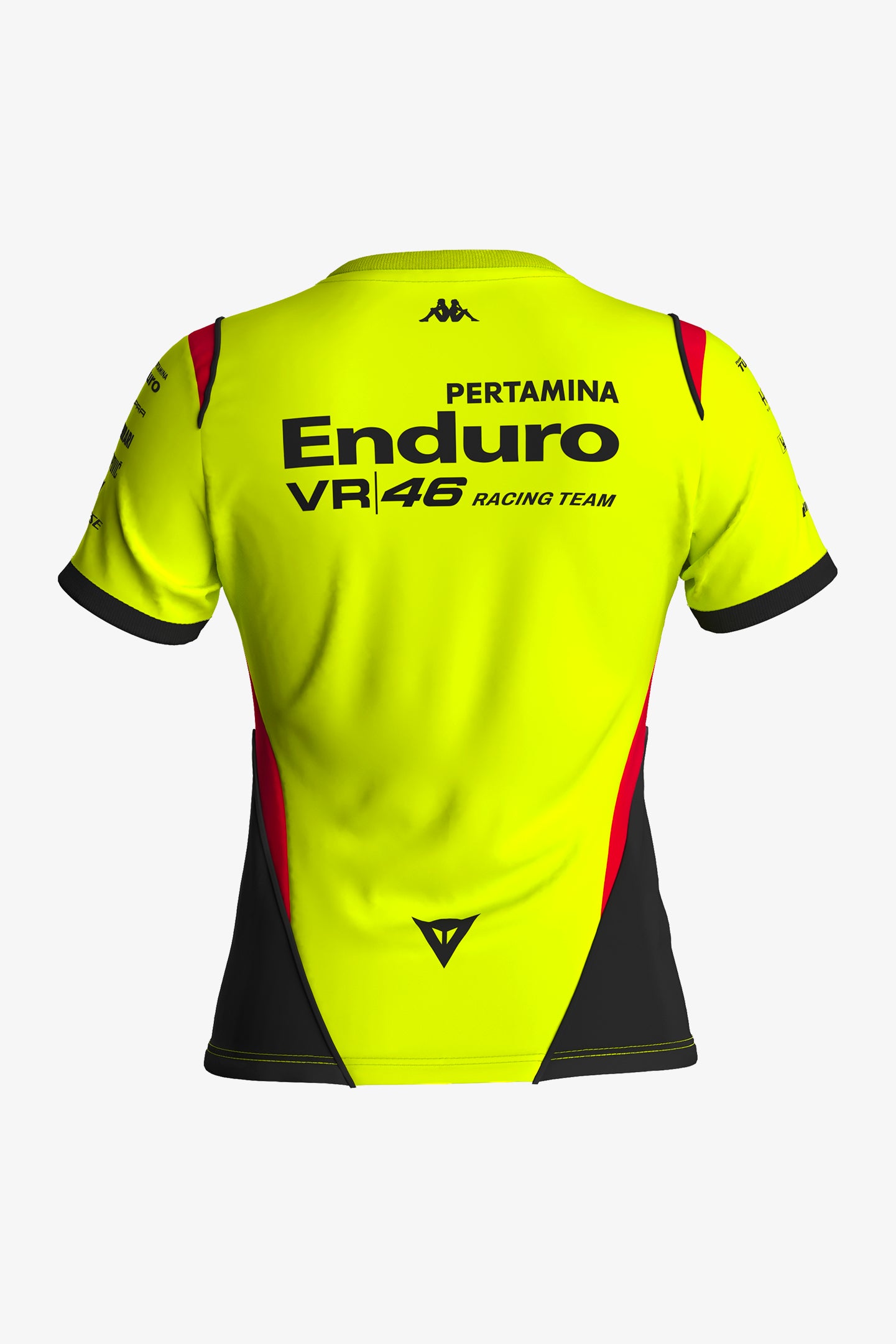 Official replica Pertamina Enduro VR46 Racing Team women's T-shirt worn by Franco Morbidelli, Fabio Di Giannantonio and the entire team during the 2026 season. Made of polyester, in collaboration with Kappa, it features the Pertamina Enduro VR46 Racing Team logo on the chest and back and the team's sponsor logos on the sleeves. Contrasting black and red details complete the design.