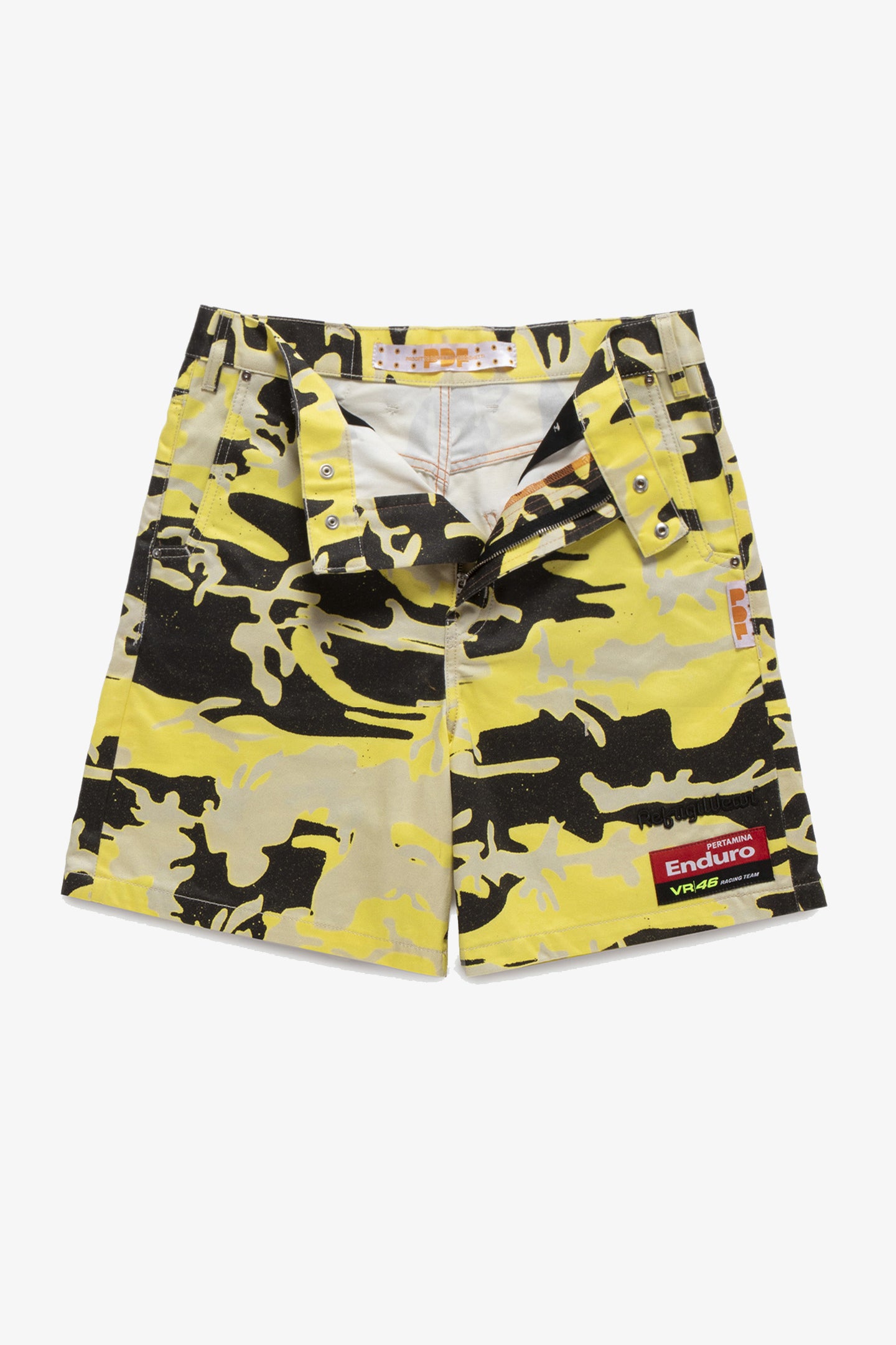 This exclusive capsule collection, available only in selected shops, is the result of a collaboration between the Pertamina Enduro VR46 Racing Team, Refrigiwear and PDF. Cotton shorts featuring a striking camouflage pattern. Featuring a modern design, they have two waist pockets and a zip and button fastening. On the bottom left are the Pertamina Enduro VR46 Racing Team patch and the embroidered Refrigiwear logo. On the back there are two pockets and a looped label bearing the PDF logo – Domenico Formichetti project.