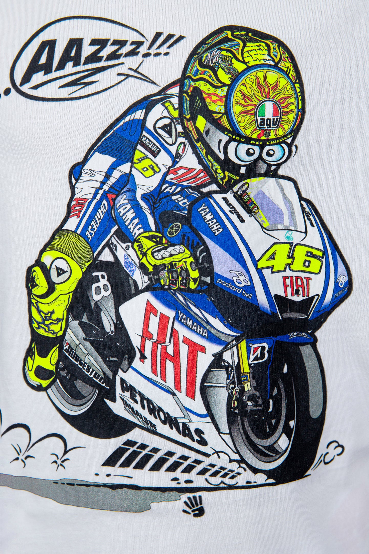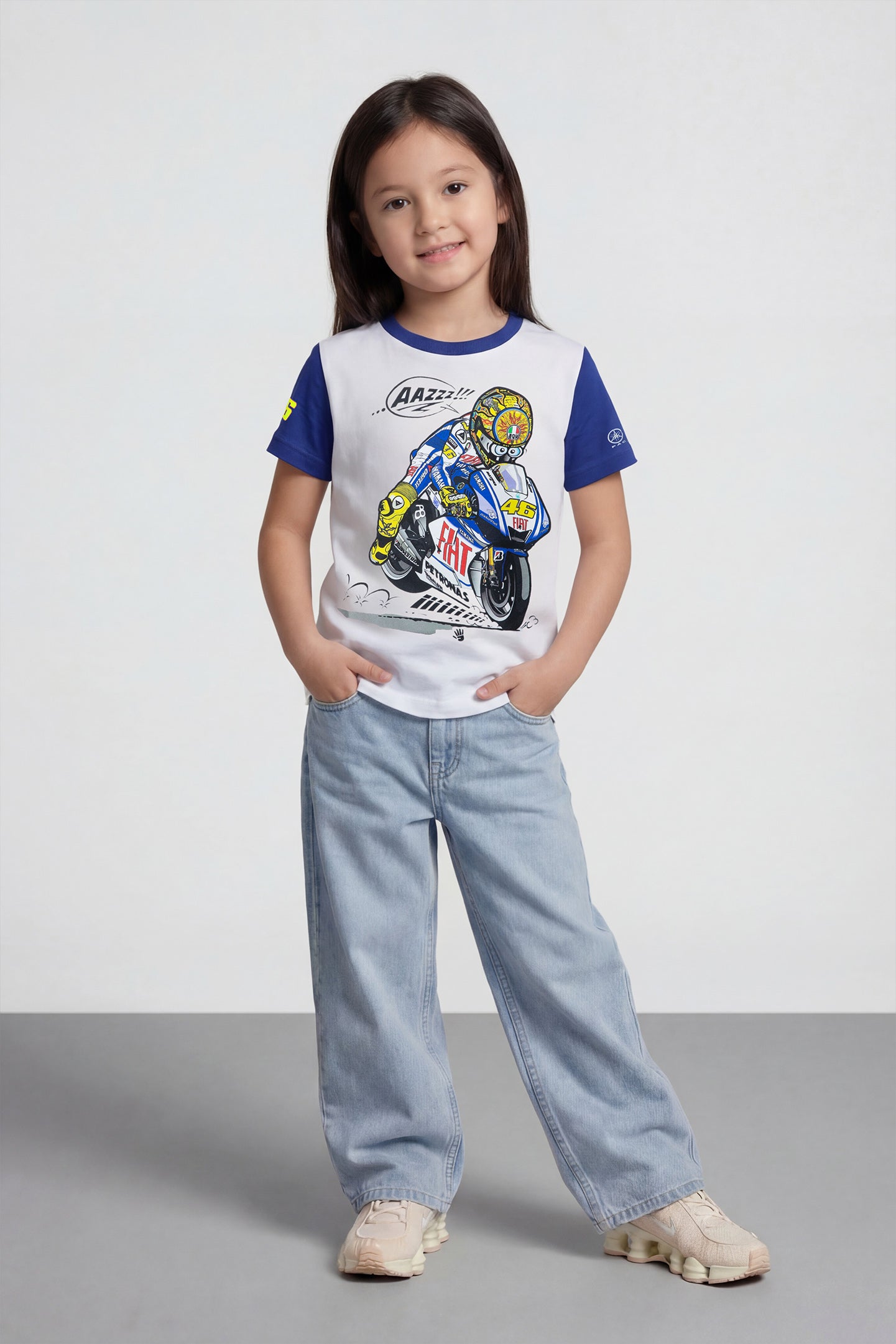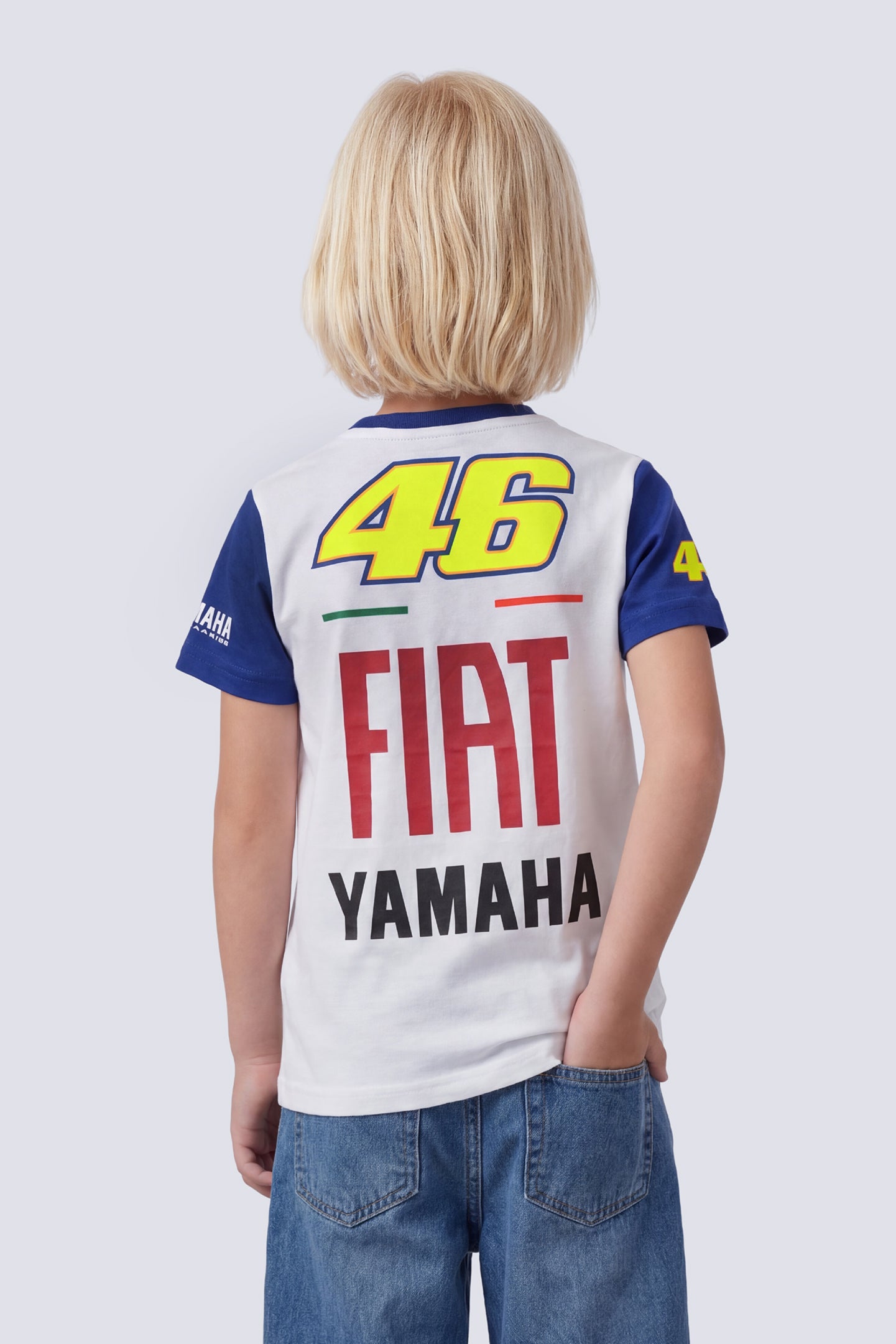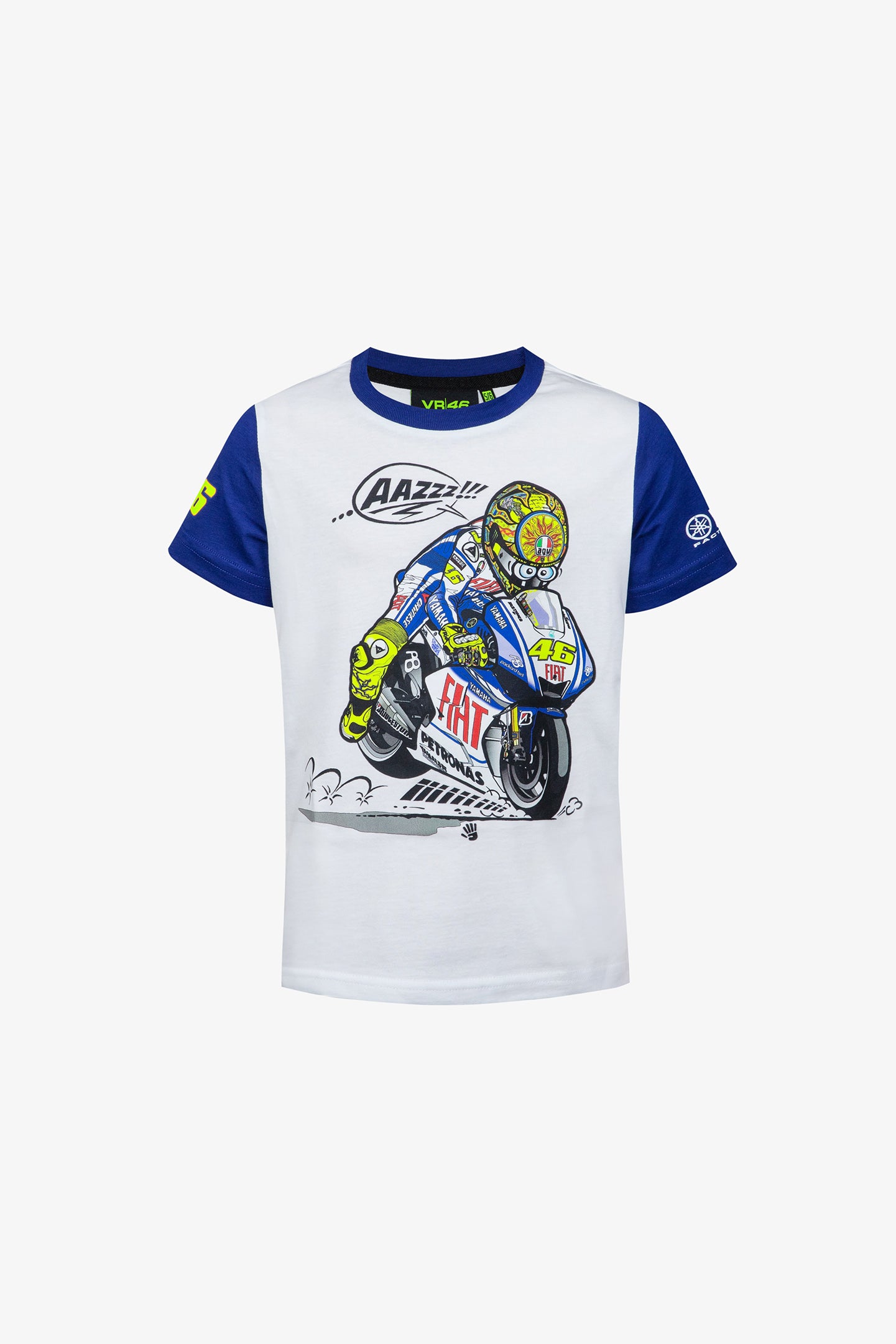 Short-sleeved children's T-shirt from the VR46 Yamaha Heritage collection, which in this version retraces Valentino Rossi's extraordinary experience with the Yamaha M1 in the 2009 MotoGP season. It is made of cotton with a regular fit. On the front there is a beautiful cartoon version of Valentino on his motorbike, on the back there is a print of the number 46, Valentino Rossi's race number, the Yamaha logo and the FIAT logo.