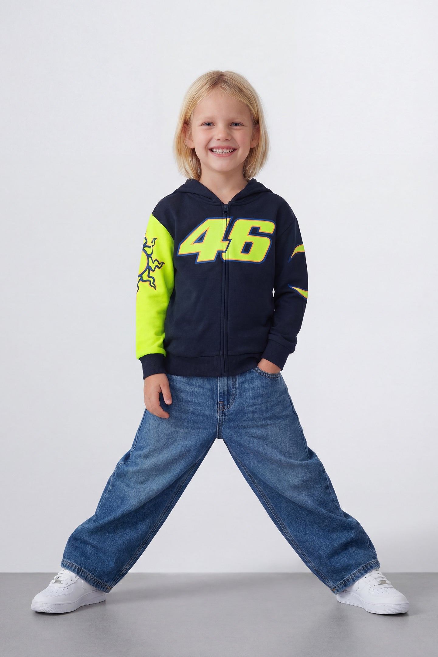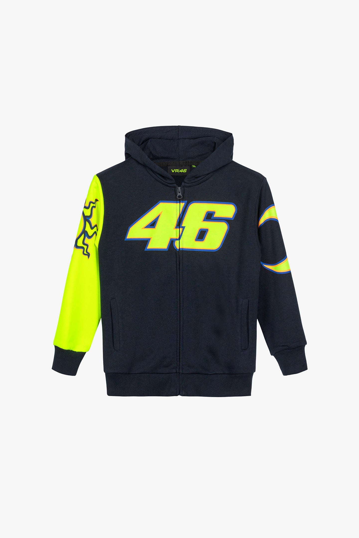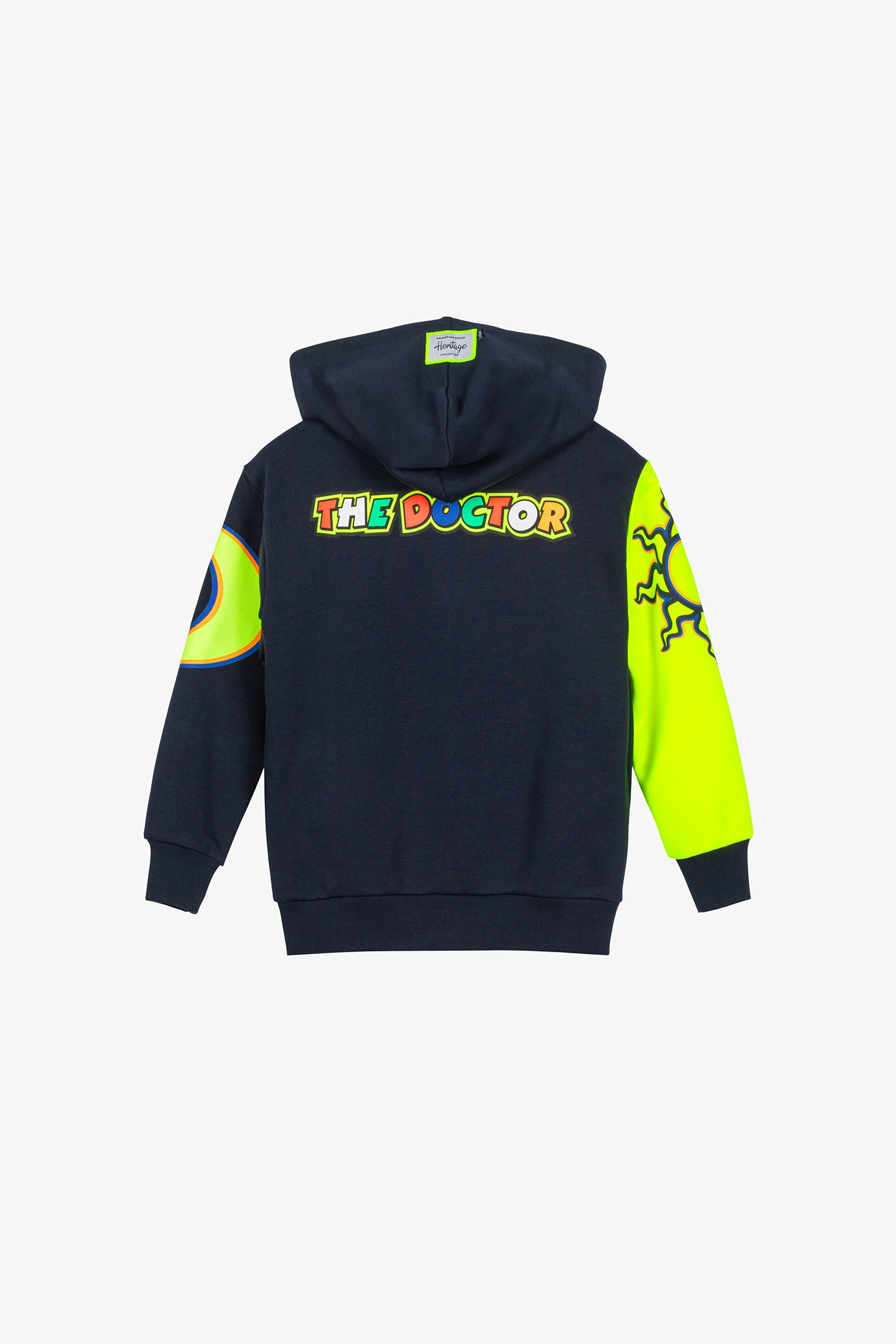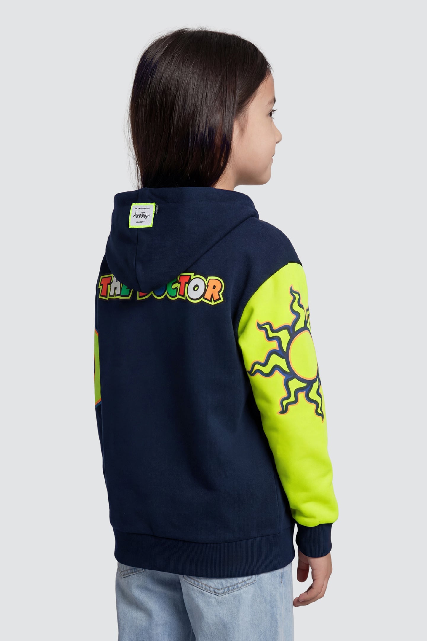 Kid hooded sweatshirt from Valentino Rossi's VR46 Heritage collection, the line dedicated to the brands and historic moments of Valentino's career. The front features a full-length zip, two front pockets and the number 46 print. The back is printed with The Doctor logo and the hood features the label that distinguishes the VR46 Heritage project. The sleeves feature Sole Luna graphics.