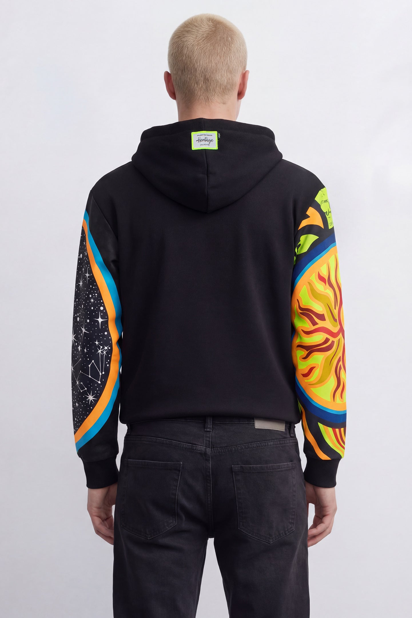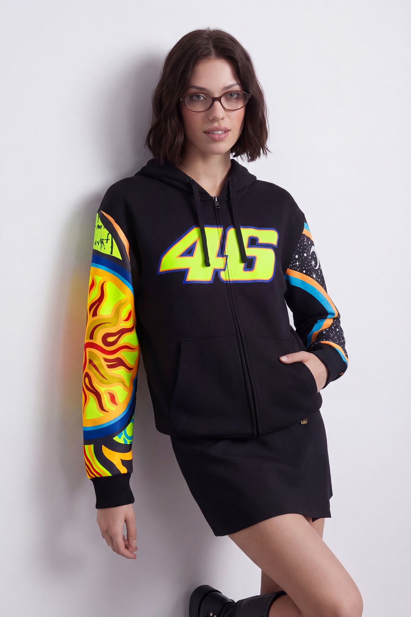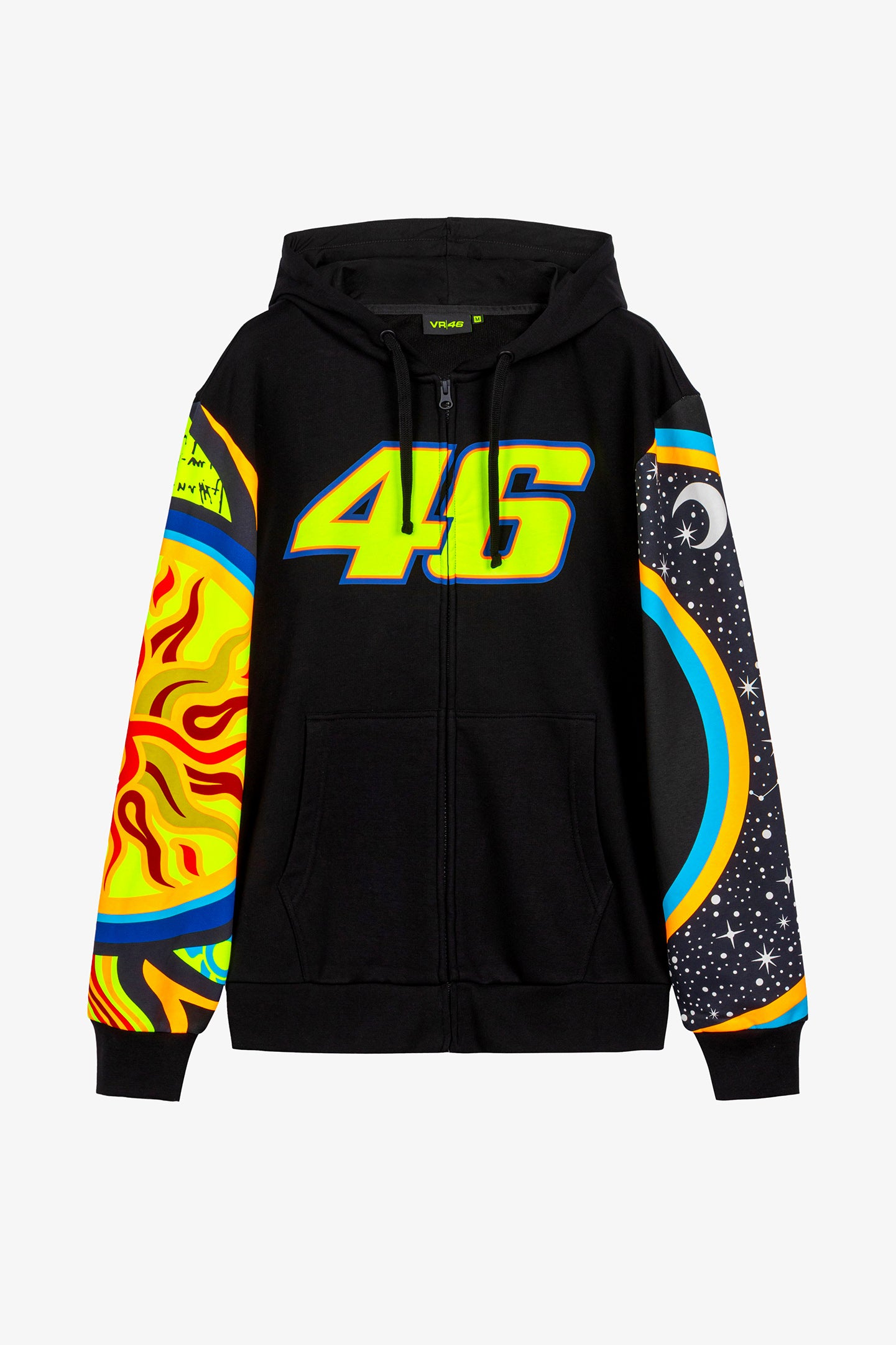 Cotton and polyester hoodie from Valentino Rossi's VR46 Heritage collection, the line dedicated to the brands and historic moments of Valentino's career. It features a full-length zip at the front, two front pockets and the number 46 printed on the front. The sleeves feature Sole Luna graphics. The hood features the label that distinguishes the VR46 Heritage project.