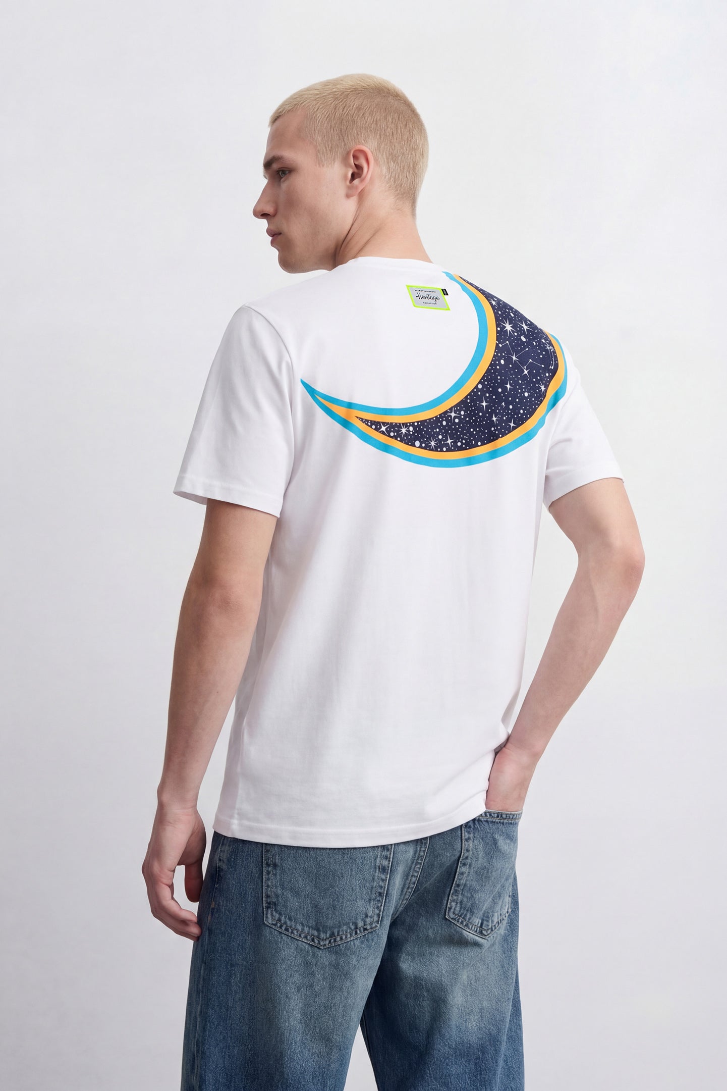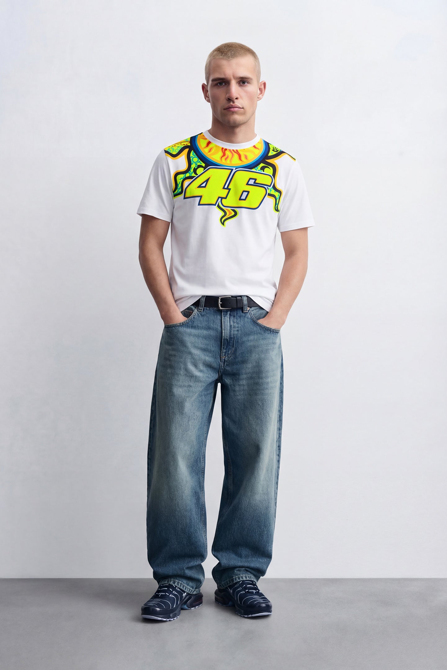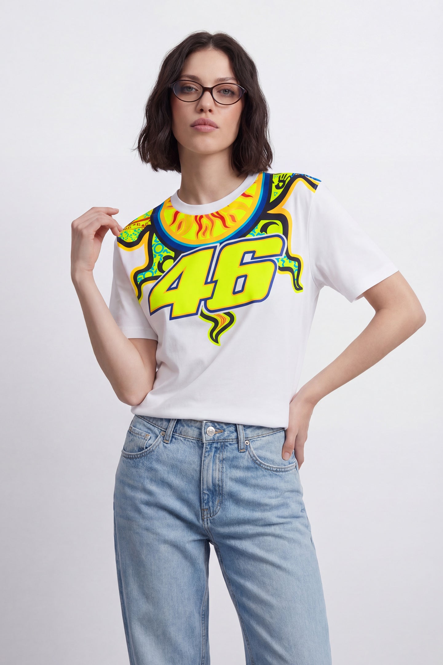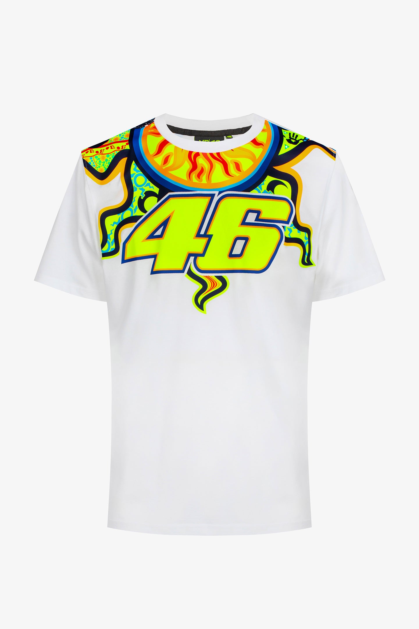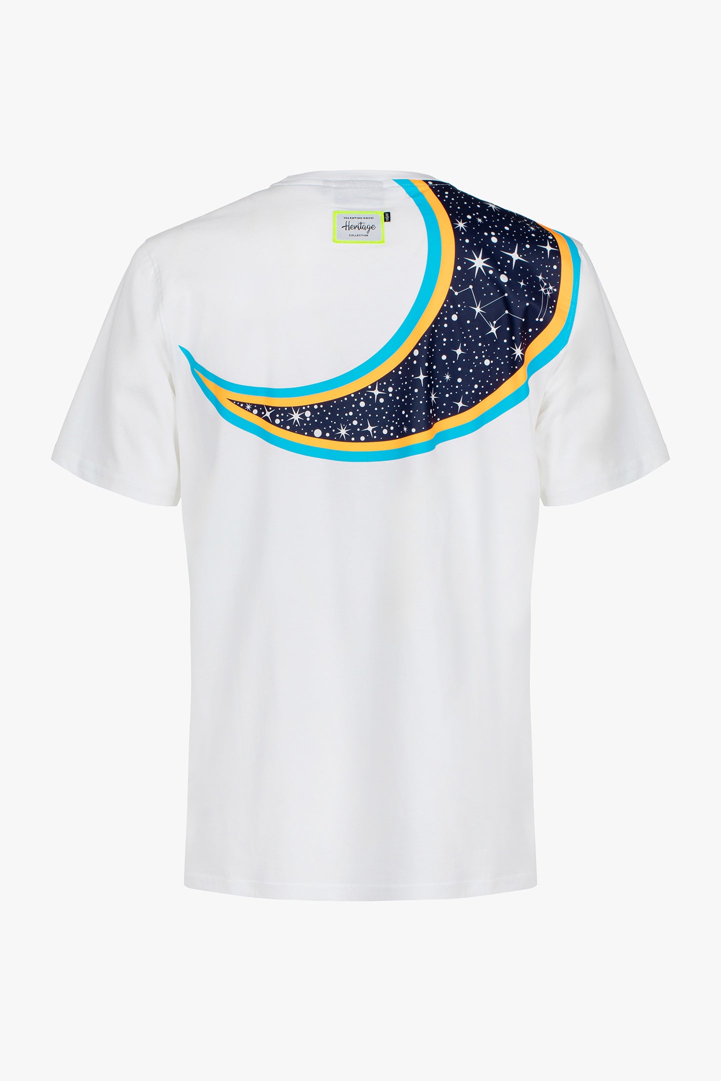 Cotton T-shirt from Valentino Rossi's VR46 Heritage collection, the line dedicated to the brands and historic moments of Valentino's career. It features a large print of the number 46 and sun graphics on the front. The moon is printed on the back, along with the label that distinguishes the VR46 Heritage project.